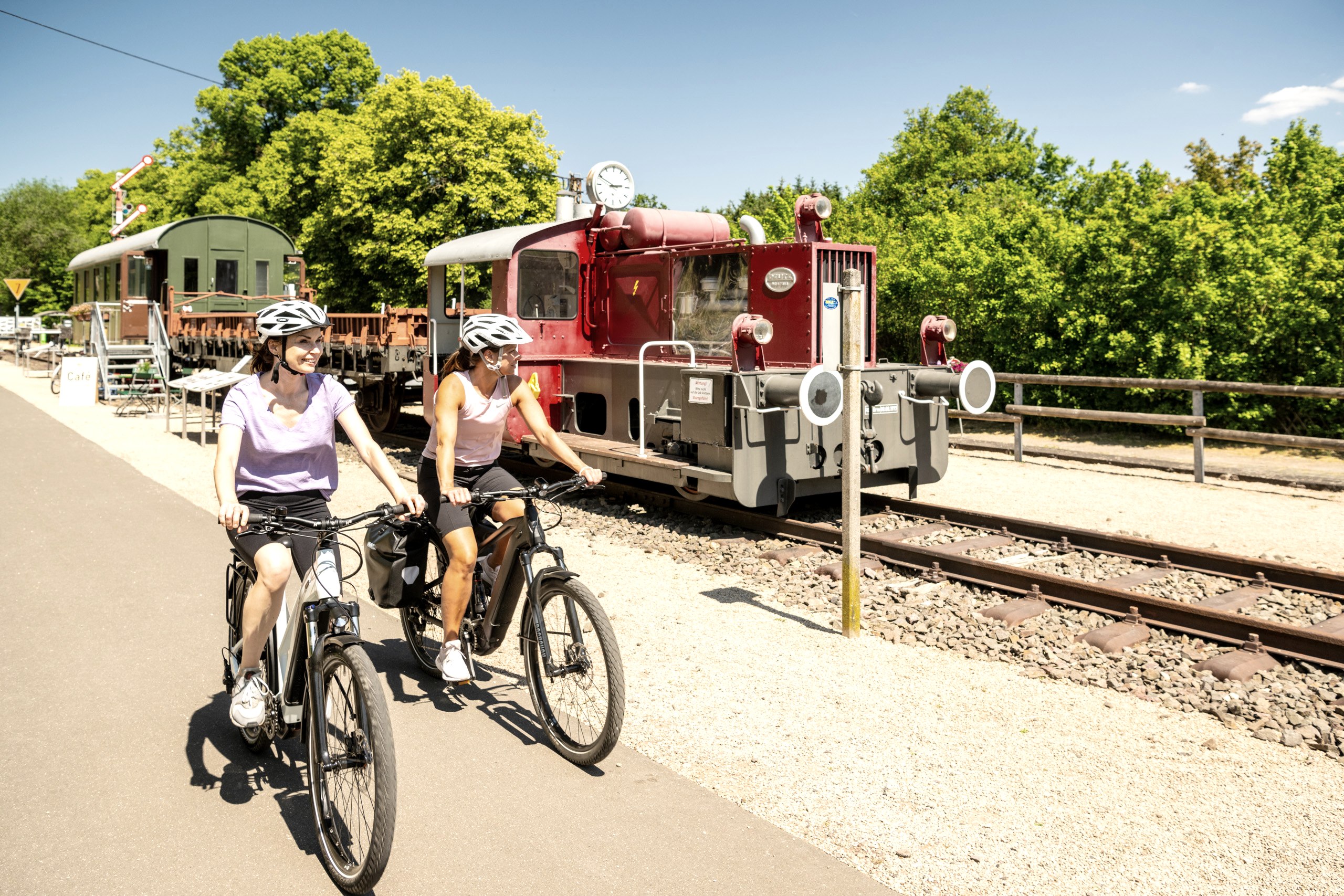 Zwei Radfahrerinnen auf einem Radweg neben einer alten Lokomotive im Eisenbahnmuseum Pronsfeld, umgeben von grünen Bäumen., © Eifel Tourismus GmbH, Dominik Ketz