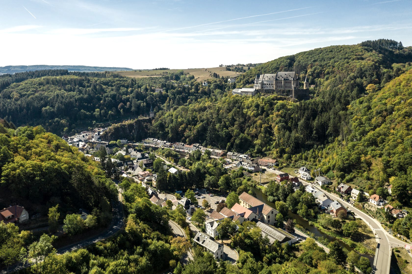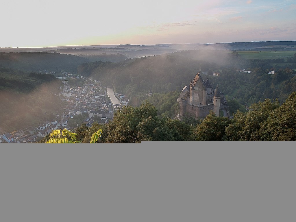 Die Nat‘Our-Route 5 startet im mittelalterlichen Vianden, etwas südlich der sehenswerten St. Rochus Kirche, die deutlich von der Staumauer überragt wird. Ihr wendet euch bergaufwärts in Richtung des wiederaufgebauten Schlosses von Vianden, eine der bedeutsamsten und mächtigsten Burgen Europas. Das Schloss ist allemal einen mehrstündigen Besuch wert. Jetzt lasst ihr es links liegen, gewinnt über Serpentinen rasch an Höhe und erreicht die Bergstation des Viandener Sessellifts. Von hier geht es nun etwas gemütlicher durch lichten Mischwald zur Bildchenkapelle, von der aus ihr eine herrliche Aussicht über die aufgestaute Our und ihr Tal habt. Bergab umrundet ihr die aus dem Berg ragende Turbine 10 und erreicht die „Ourdall-Promenade“, der ihr bis zur blauen Brücke hinter Bivels folgt. Hinter der Brücke seid ihr nun auf deutschem Boden. Bergan führt ein Waldweg zum Felssporn, auf dem die Ruine Falkenstein thront. Die Burg kann nicht betreten werden, allerdings bietet ein kleiner Pavillon vor dem trutzigen Eingangsportal bezaubernde Dornröschen-Romantik mit Burgblick.