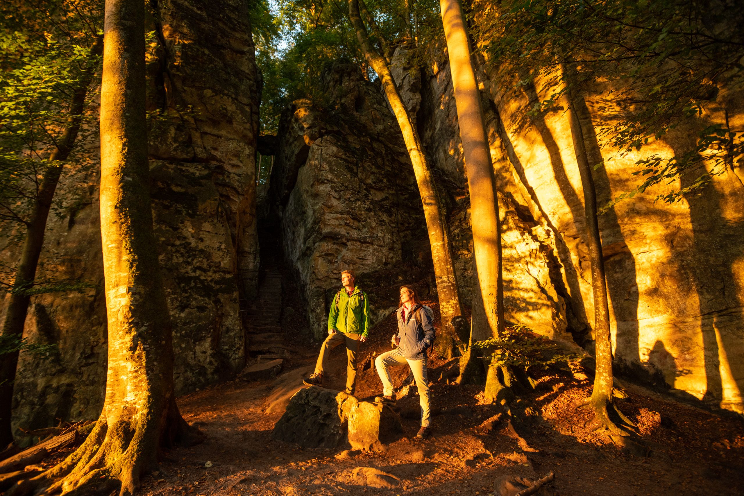 Im deutsch-luxemburgischen Naturpark erscheint die von wuchtigen Sandsteinmassiven geprägte Landschaft so bizarr, dass sie fast nur ein Werk des Teufels sein kann… allerdings eines Teufels mit Sinn für die Abenteuerlust von Wanderern. Das Ferschweiler Plateau in der Eifel ist an seinen Rändern wild zerklüftet und von tiefen Schluchten durchzogen. In dunklen Felsspalten und Höhlen lernt man mit Gänsehautgefühl den Respekt vor der Natur.