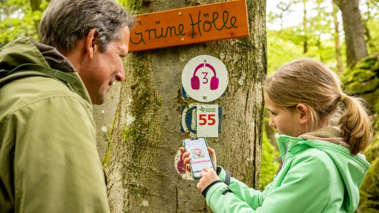 Marco Neises, gebürtiger Bollendorfer und Schöpfer genialer Lauschtouren, ist mit Menschen aus dem Dorf unterwegs. An 10 Hörstationen im Bollendorfer Wald erzählen sie ihre Geschichten über die Felsen, Tiere, Geschichte und Aussichtspunkte. So packt Paul Colljung Schmugglergeschichten aus, der Hausarzt gibt Tipps und Wanderführer Manfred Schmidt warnt vor einer 300 Jahre alten Kräuterhexe...Die Audiotour "Grüne Hölle Bollendorf" können Sie kostenlos per App auf Ihr Smartphone herunterladen.