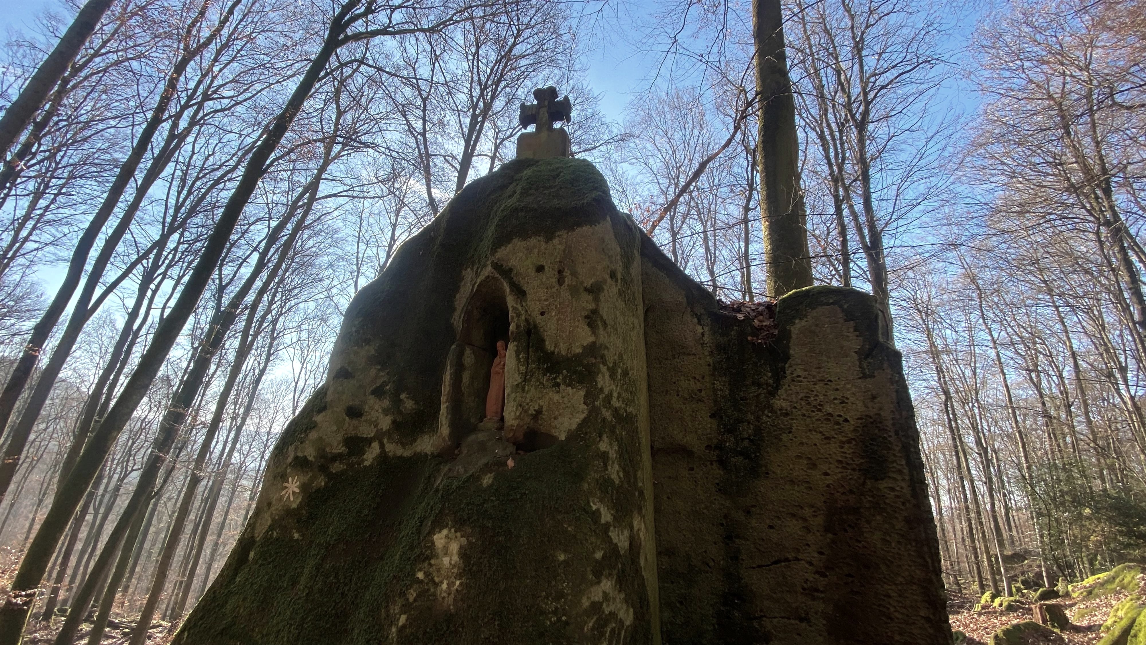 Dieser Felsen hat die Form einer Kapelle und in seiner Mitte befindet sich eine natürliche Nische, in der eine Muttergottes aufgestellt worden ist. Auf dem Fels hat man einst ein Kreuz angebracht. Man geht davon aus, dass Arbeiter, die im Bollendorfer Wald seit Jahrhunderten Sandsteine gebrochen haben, die Bildcheslay aus Dankbarkeit, dass sie heil abends nach getaner Arbeit zu ihren Familien nach Hause kehren konnten, regelmäßig zum Beten aufgesucht haben.