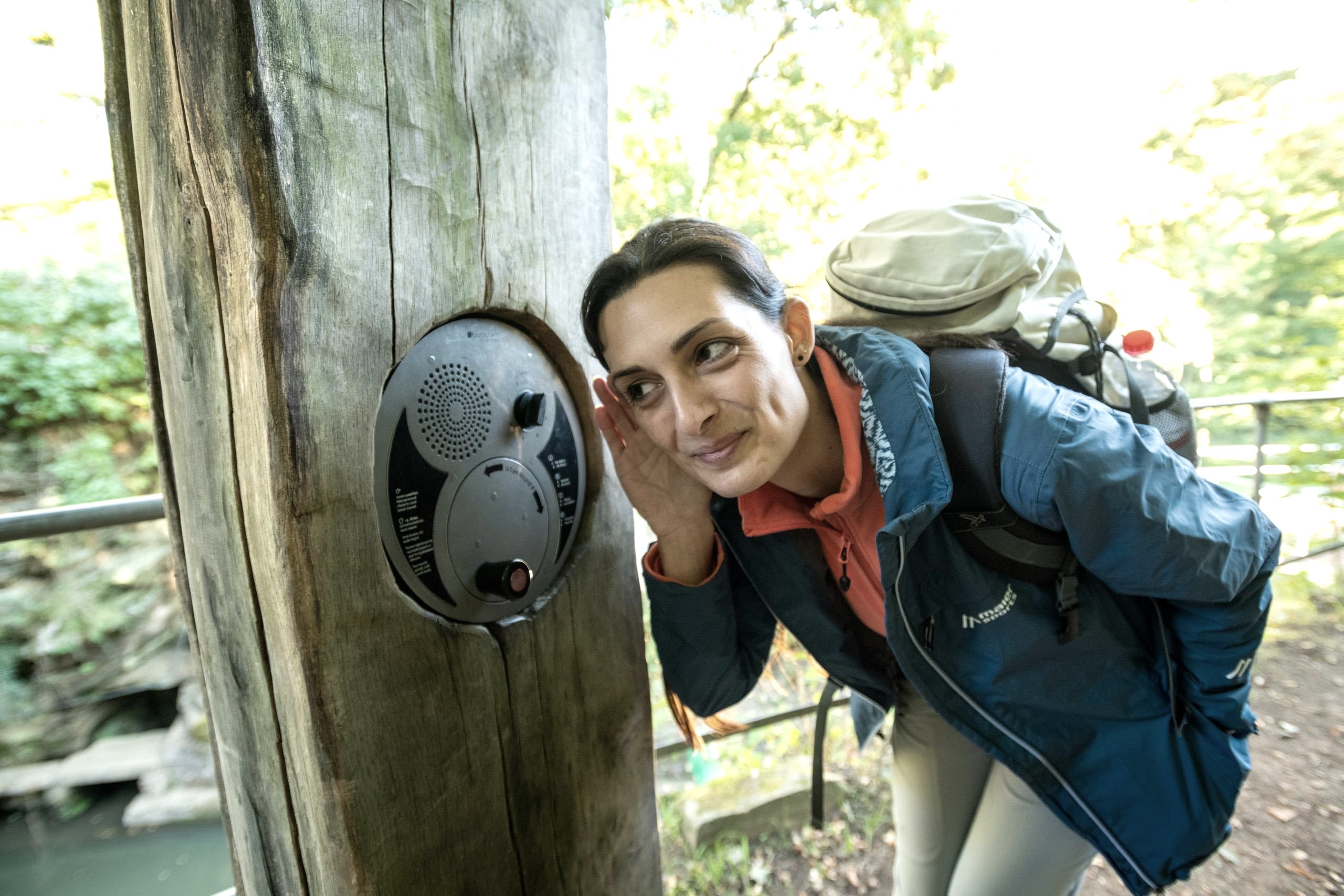 Die "Lauschkurbel": Oberhalb des Weihers auf einer kleinen Plattform kann man eine ungewöhnliche "Lauschstation" ausprobieren: Wer an der Kurbel dreht, die in den Holzstamm eingelassen ist, erfährt Interessantes und Spannendes über die Geschichte und die Besonderheiten des Felsenweihers.