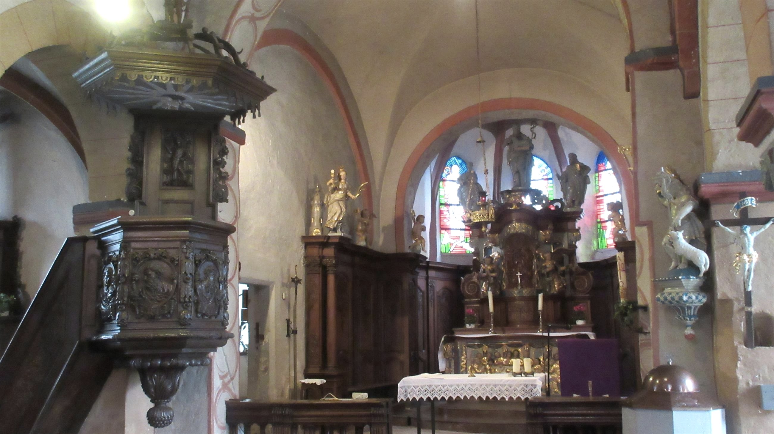 Besondere Kostbarkeiten sind die kunstvollen romanischen Kapitelle, die spätgotischen Malereien im südlichen Seitenchor sowie der barocke Altar.
