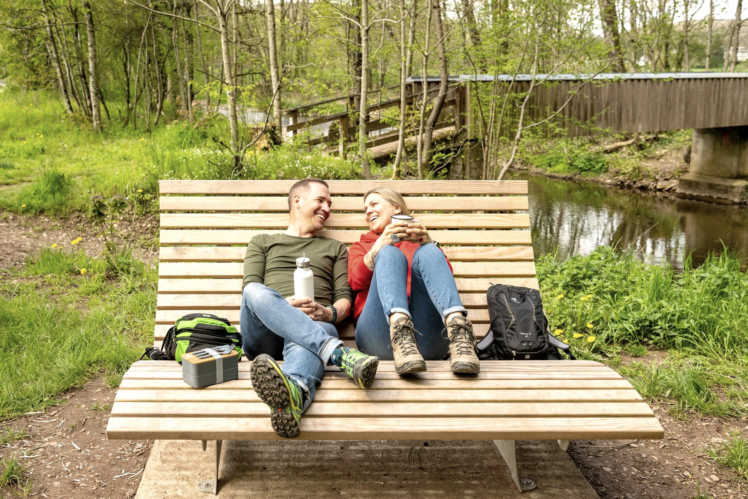 Eine gemütliche Holzliege mit Premiumblick auf den beeindruckenden Prallhang lädt als Rastplatz und zu einem Picknick ein.