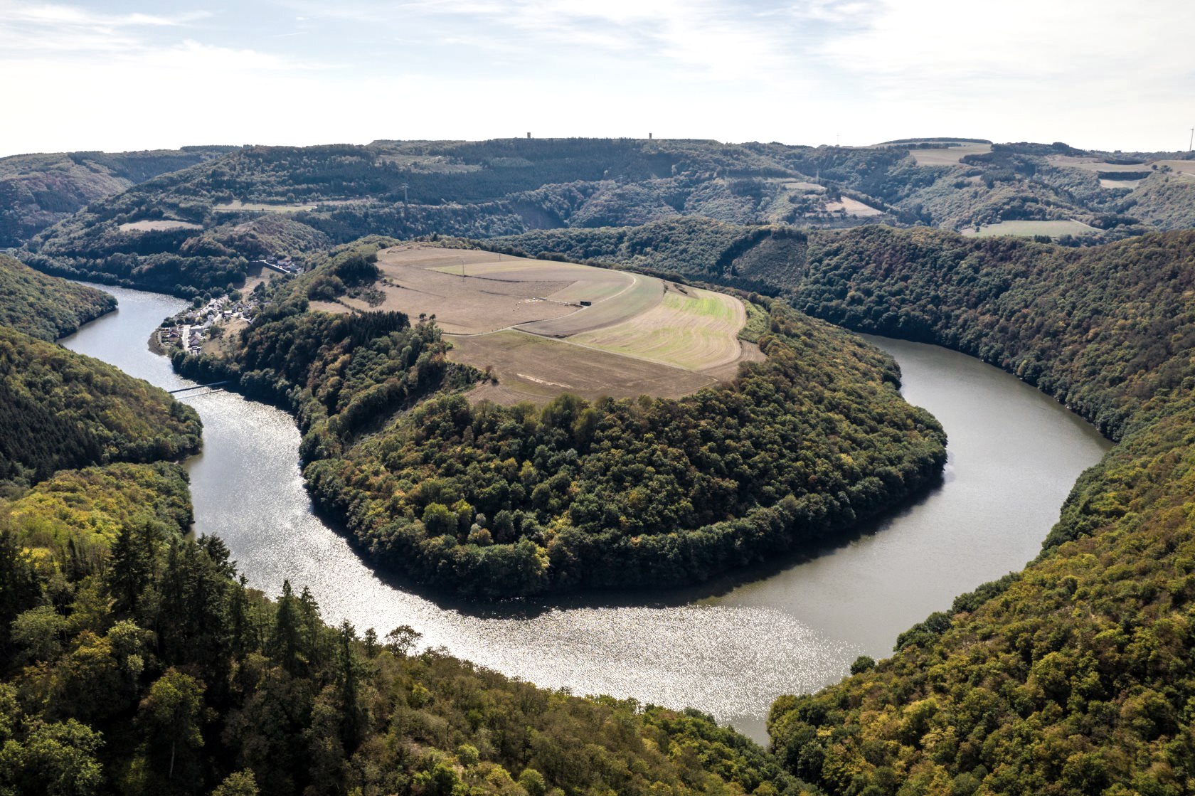 Of what you see, much is man-made. Until the 1950s, the Our made its loop around Bivels as a small stream, which looked very different then. The St. Nicolas mountain opposite still had a real knoll and there was no reservoir yet. The landscape bears witness to one of the most imposing construction projects in Luxembourg in the middle of the last century. Almost invisible, one of the largest pumped storage power plants in Europe is located here. Deep in the rock, the floods rush in giant tubes between the reservoir and the upper basin on Mont St. Nicolas. Much older mining history is told by the copper mine in Stolzemburg. Much older still: the history of Falkenstein Castle, of which the residential building and castle ruins are still preserved today.