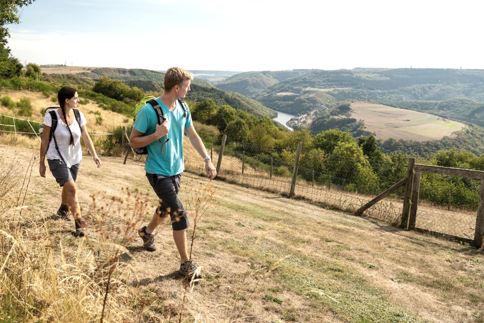 A magnificent landscape composition awaits you on this fascinating hiking tour in the NaturWanderPark delux! It is probably one of the most beautiful postcard motifs in the NaturWanderPark delux, which spreads out before you here: The Ourtalschleife a little north of Vianden. In the valley lies the village of Bivels with the striking blue bridge, above it the wooded hilltop with a light-green clay soil, surrounded by the deep blue-green of the broadly dammed Our, framed by steeply rising oak forests. And in the middle of it all, the ruins of Falkenstein, perched on a mighty slate spur. It is the first to peel out of the mist when the morning sun floods the Our valley. Even if you're eager to get going, head for the lookout point at the Waldhof-Falkenstein barbecue hut to get in the mood for the tour - gorgeous! Alternatively, you can reach and round the Nat'Our Route from here via a short access path, officially it starts in Bivels.