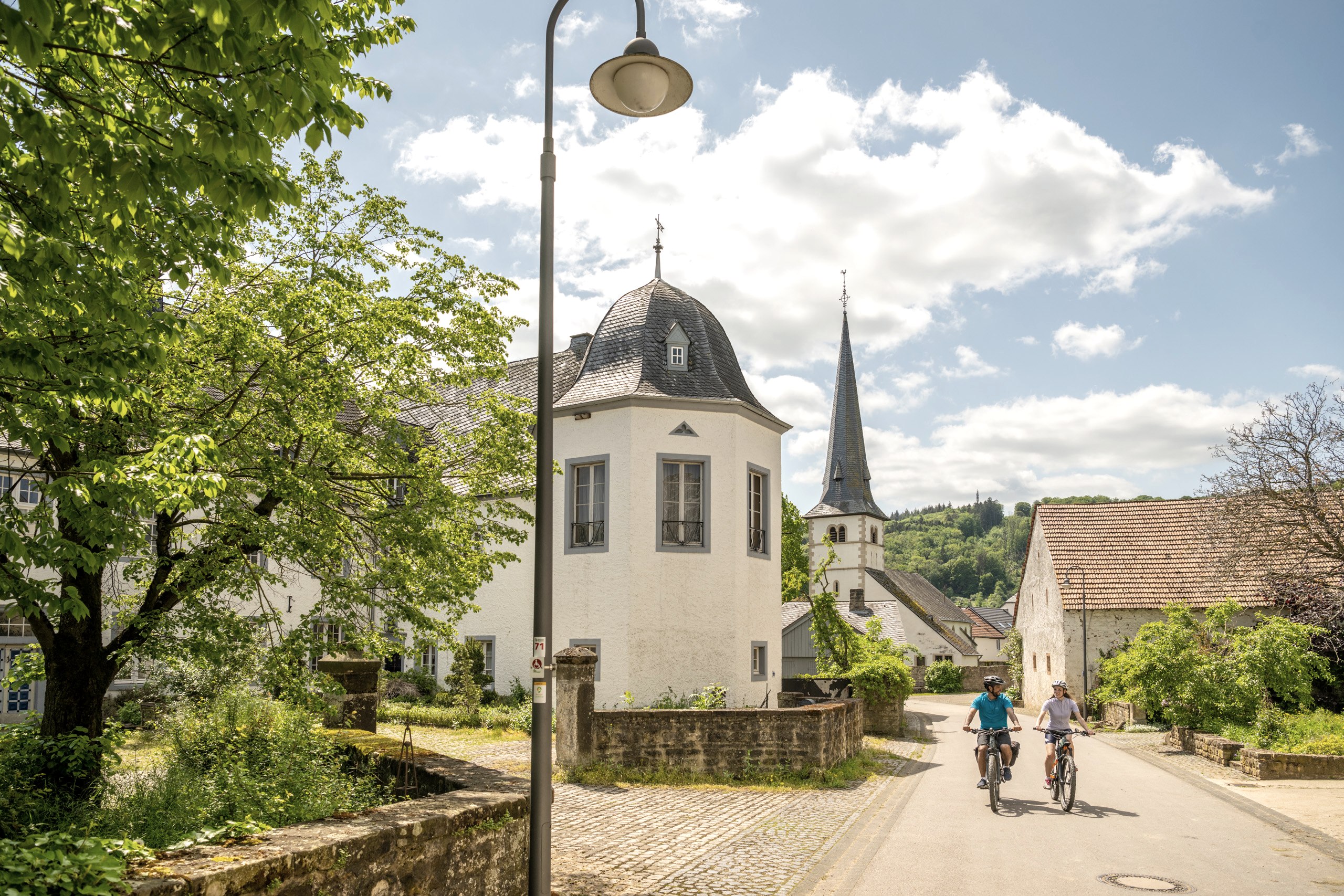 On this challenging but varied tour you can experience many highlights of the southern Eifel. The tour leads along the Prüm and Nims cycle paths past the 700-year-old moated castle of Rittersdorf, the Bitburg reservoir in Biersdorf am See. Between Holsthum and Irrel you will encounter hop fields, where one of the most important ingredients for the taste of the famous Bitburger Premium Pils grows, the Bitburger seal hops.You cross picturesque Eifel villages and discover again and again beautiful farmhouses that have been restored with great attention to detail.Open plateaus with beautiful views of the Eifel landscapes are characteristic of this tour. The first section of the route is accompanied by the Prüm, a tributary of the Sauer. Sometimes the water shimmers through the beautiful forest landscape, sometimes you look down on the course of the river from above. From Irrel the Nims accompanies us and on the former railroad line sculptures made of Eifel sandstone decorate the Nimsradweg.