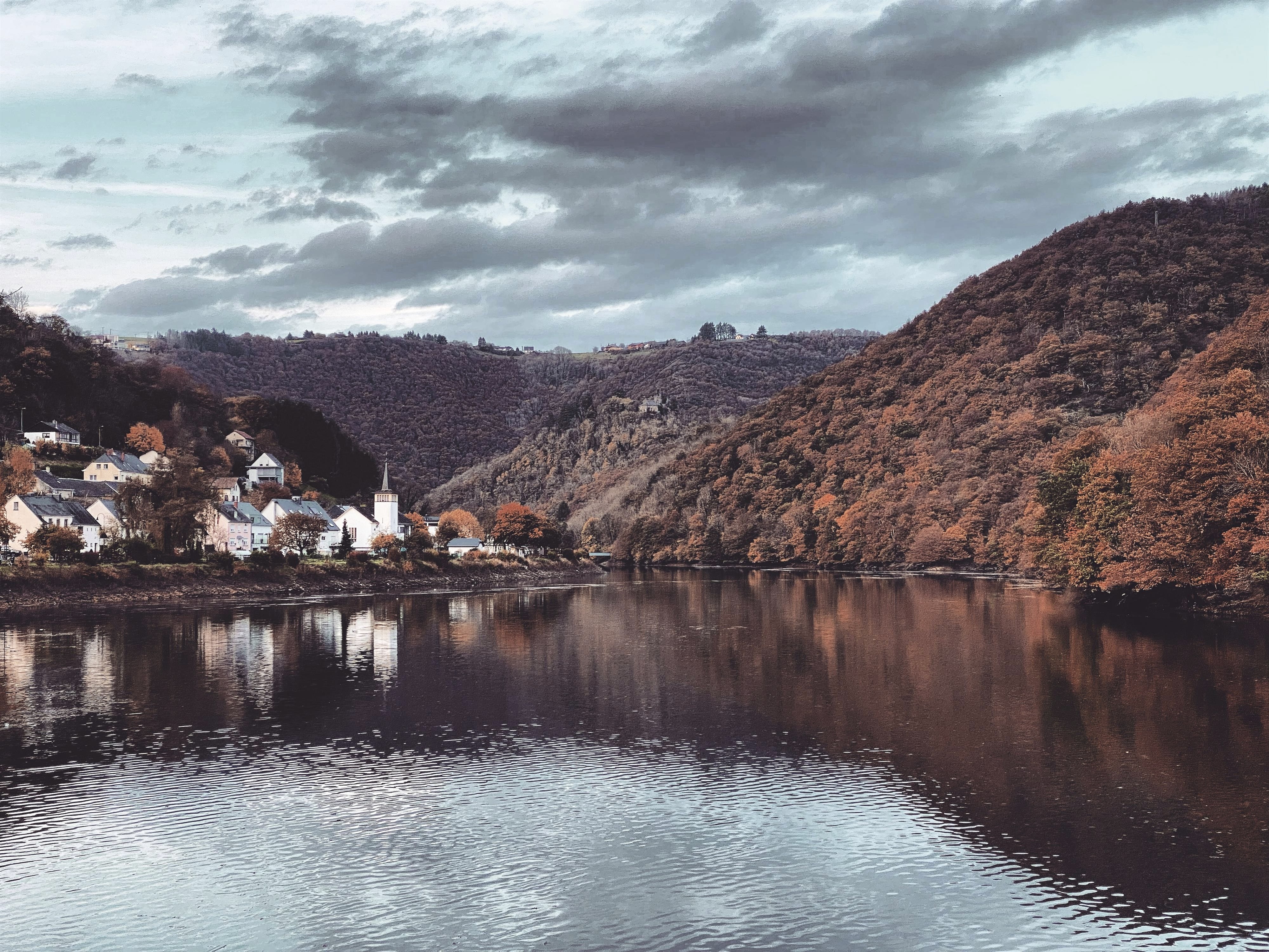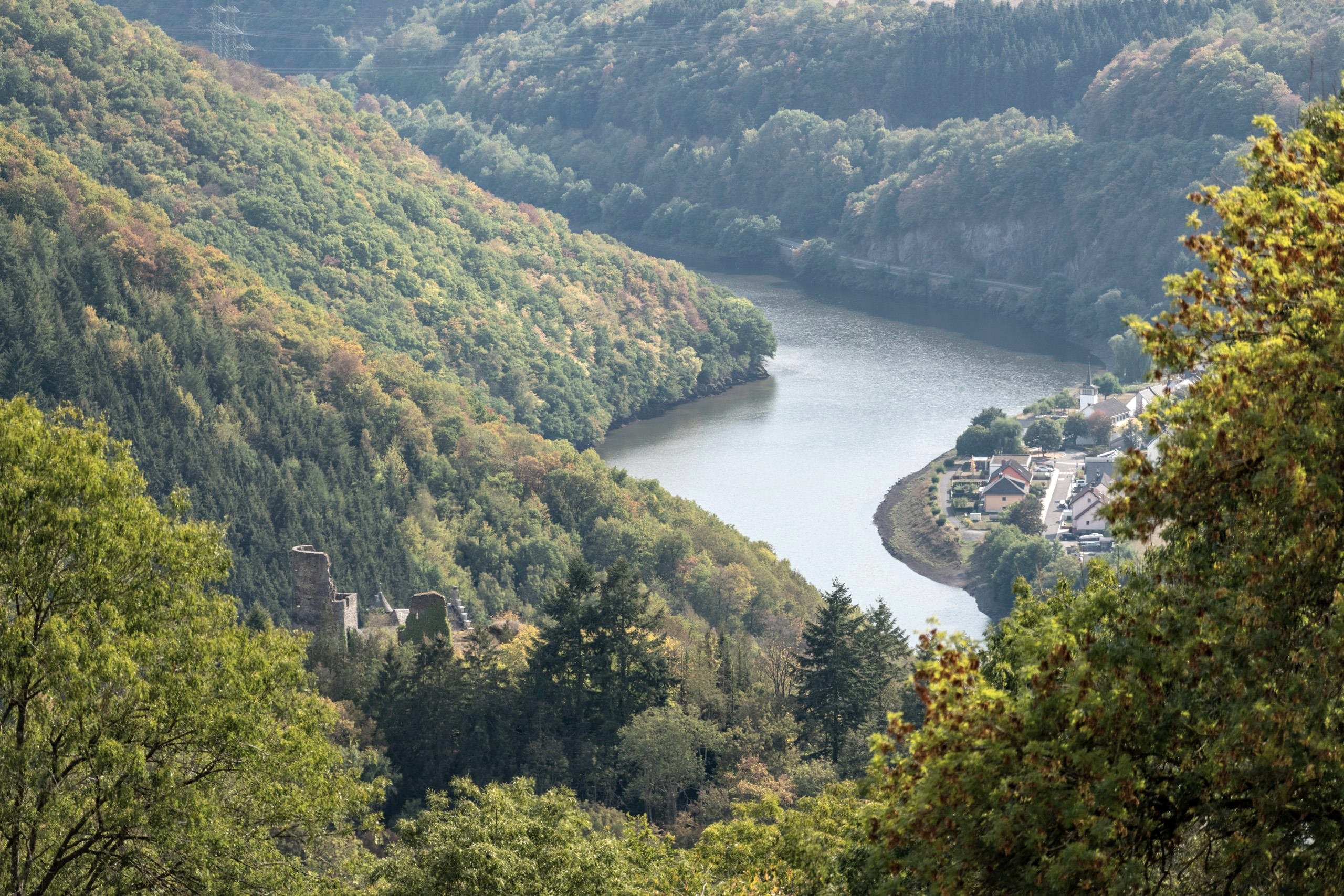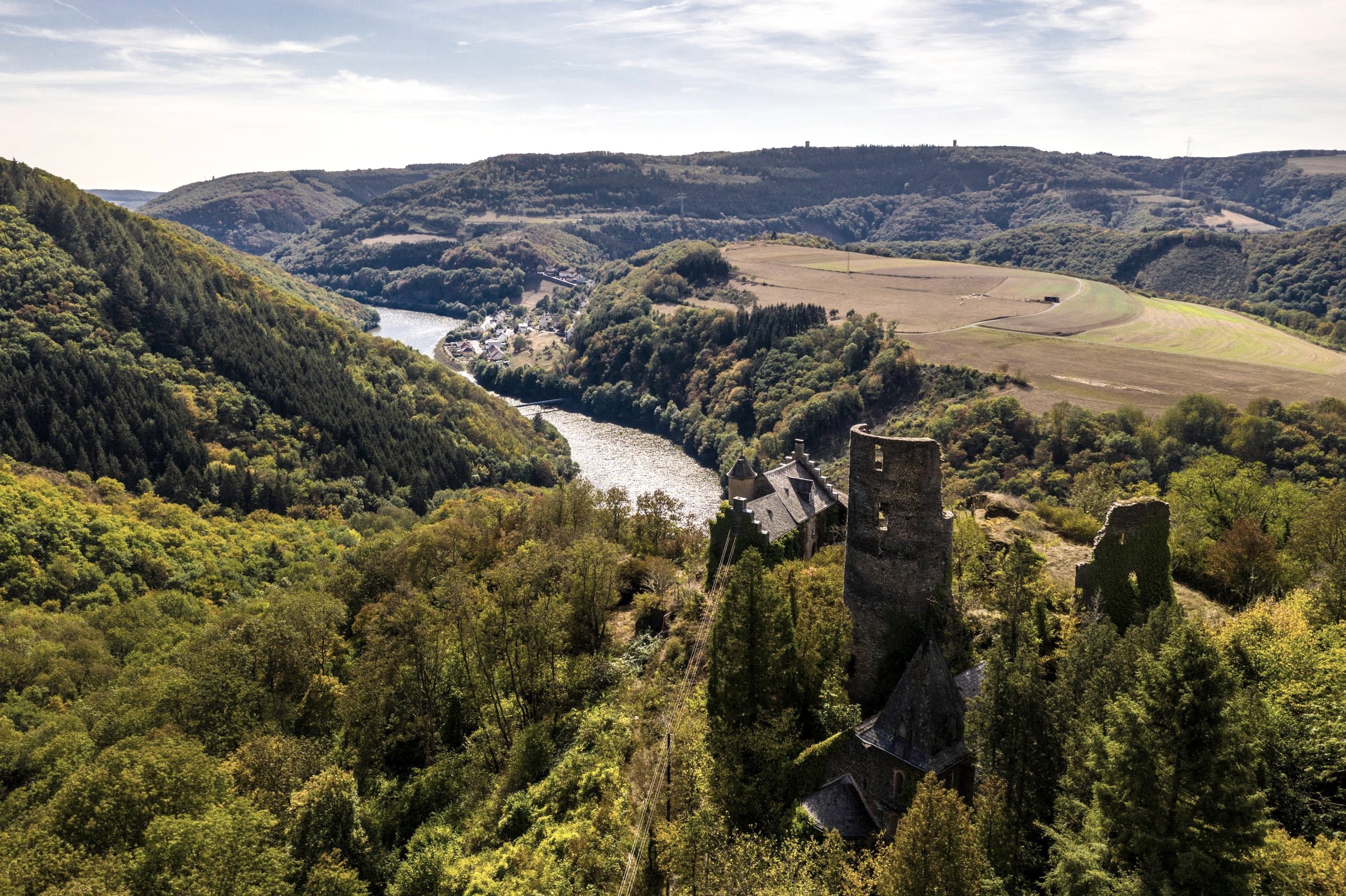 The ruins of Falkenstein Castle rise on a steep mountain spur high above the Our valley. Below the castle, the Our meanders in a striking bend, forming the border with the Grand Duchy of Luxembourg.