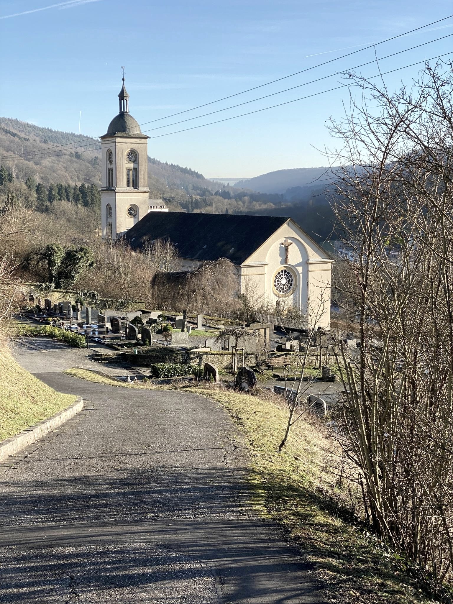 The parish church of Bollendorf, which lies parallel to the Sauer on a slope, was built in 1838/39 according to the plans of Johann Georg Wolff, the city architect of Trier at the time. It is a hall building with a classicist columned age and an attached tower.