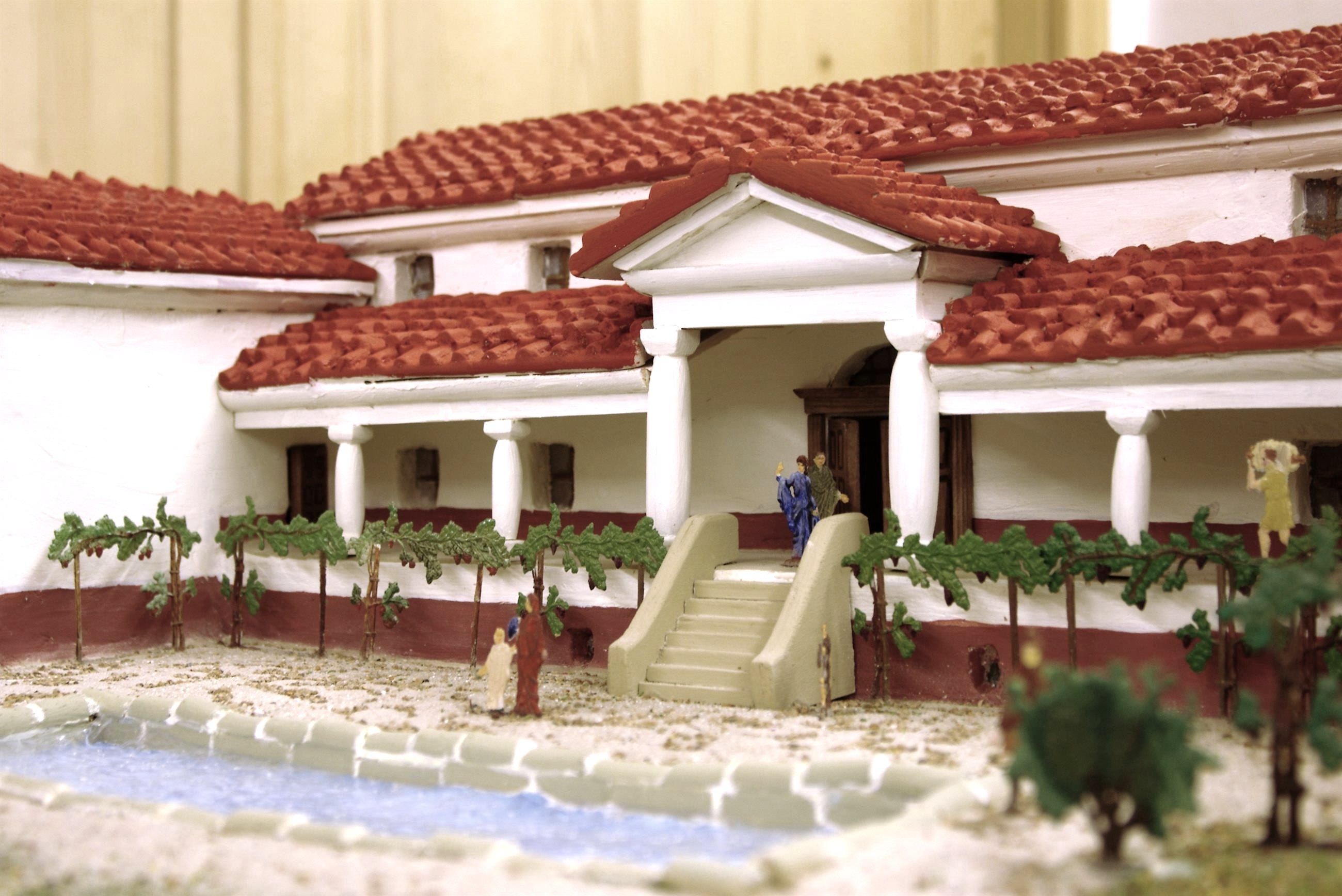 The building material for the imposing building, which is over 47 metres wide and almost 24 metres deep, was Luxembourg sandstone from the surrounding area. The walls were plastered and painted: The plinth area was red, the walls above white. The roofs of all parts of the building were covered with tiles. Fragments of coloured interior plaster and window glazing have also been preserved. A staircase led up to the portico and from there to the core building with five rooms. The oven in the corner of the larger main room was obviously not only used for cooking, but also for forging. The staircase to the first floor of the building was located in a room at the back. Barely trodden sandstone steps lead down to the cellar, where the brick pillars that supported a wooden beamed ceiling can still be seen. Niches in the walls were probably used to store lamps or vessels. Behind a barrier of wickerwork in the cellar floor made of tamped earth, special storage goods were probably kept. In the north-west corner tower of the house was the bathing area with all the rooms typical of a Roman bath. At least part of this large house was inhabited until around the middle of the 4th century. It is possible that it was partially destroyed during the Germanic invasions in the 3rd century.