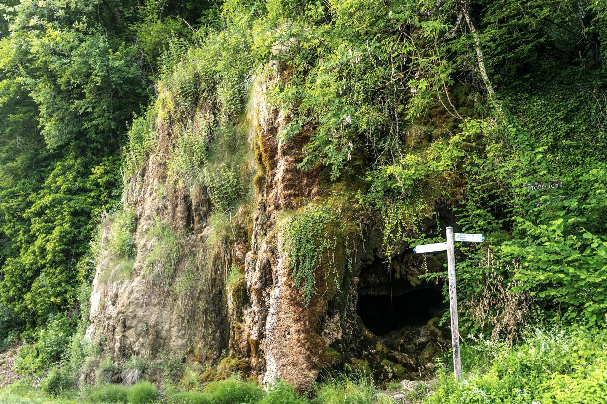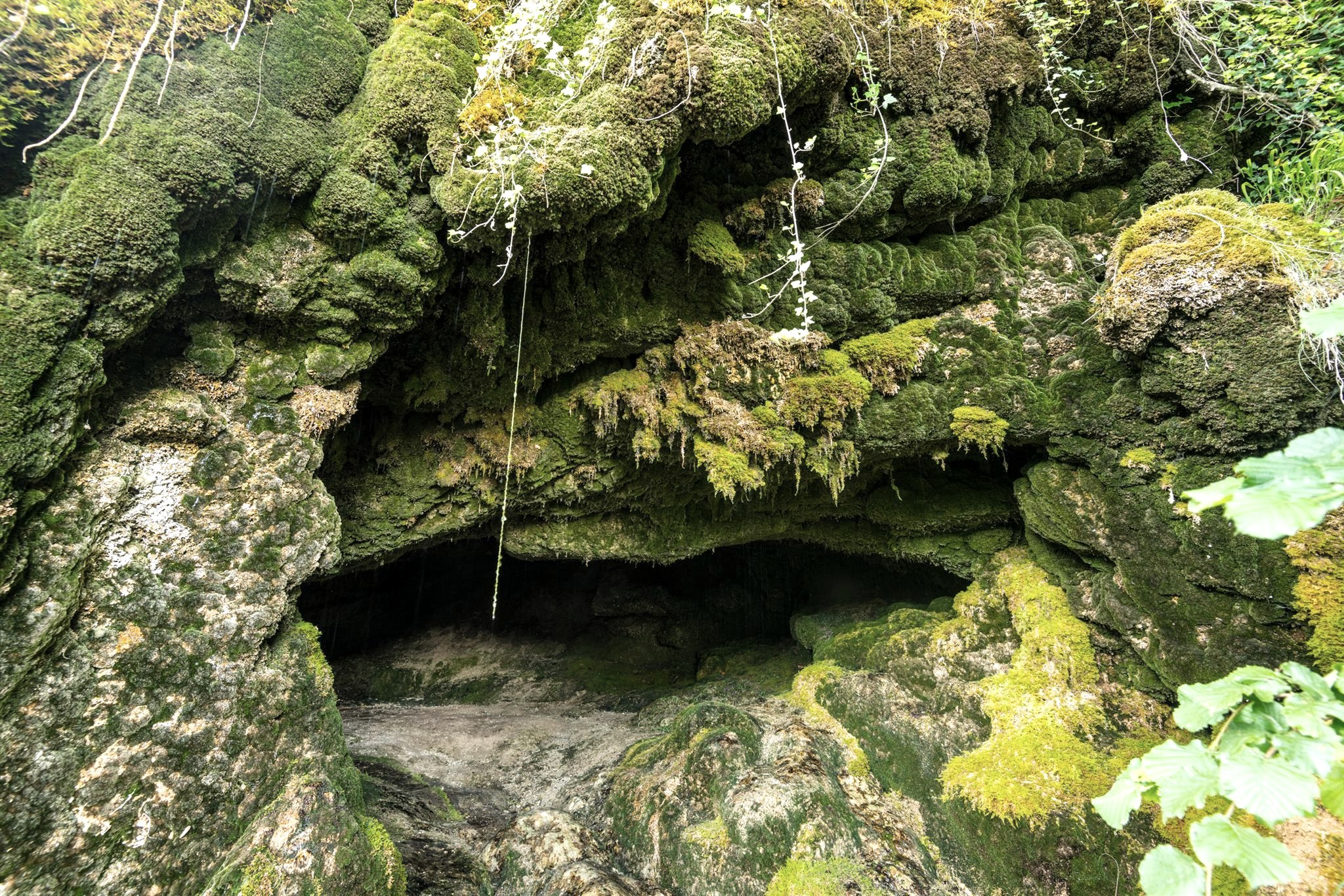 The explanation for this phenomenon: when rainwater seeps through the thick sandstone layer of the plateaus, it dissolves the calcareous binder that holds the quartz grains of the rock together. Where spring water emerges from slopes and valley cuttings, but also in the banks of streams or rivers, the carbonic acid escapes from the soluble lime compound, the water evaporates and what remains is an almost pure limestone. It is called calcareous sinter or calcareous tufa. The lime sinter is deposited along the flow paths of the water and covers mosses and plant parts with a stony crust. This creates fascinating rock formations. The process of calcareous tufa formation continues, the rocks "grow" like stalactites.