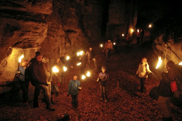 Even in daylight, the rocky landscape of the Devil's Gorge appears mystical and full of secrets. Hiking through it in the dark, illuminated only by the light of torches, will leave you with unforgettable impressions. All your senses are wide awake; light and shadow bring the weathered rocks with their crevices and fissures to life, every sound, every noise is clearly audible. When the flickering light is reflected back from the rock faces, it is a good time for fairy tales and stories, which our rangers will tell you during the tour through the darkness. And they also know lots of exciting facts about the unique rocky world of the Devil's Gorge when the time is right. After the tour, mulled wine or children's punch awaits the hikers and everyone can reflect on the impressions and experiences of the torchlight hike around the warming campfire.