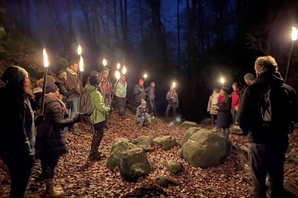 Even in daylight, the rocky landscape of the Devil's Gorge appears mystical and full of secrets. Hiking through it in the dark, illuminated only by the light of torches, will leave you with unforgettable impressions. All your senses are wide awake; light and shadow bring the weathered rocks with their crevices and fissures to life, every sound, every noise is clearly audible. When the flickering light is reflected back from the rock faces, it is a good time for fairy tales and stories, which our rangers will tell you during the tour through the darkness. And they also know lots of exciting facts about the unique rocky world of the Devil's Gorge when the time is right. After the tour, mulled wine or children's punch awaits the hikers, and everyone can reflect on the impressions and experiences of the torchlight hike around the warming campfire.