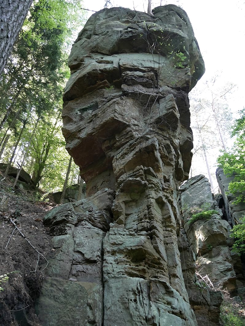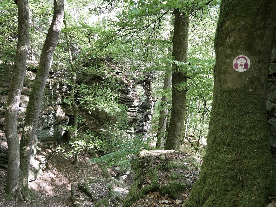 Le diable est-il intervenu dans la formation du monde rocheux primitif et sauvage de cette région ? Les nombreux noms "diaboliques" le laissent supposer. Et ceux qui traversent l'étroit gouffre couvert de végétation de l'Enfer vert près de Bollendorf peuvent également le penser. Mais peut-être s'agit-il en fait d'un ancien fond marin transformé en pierre, auquel d'énormes éboulements et glissements de terrain à l'époque glaciaire et des plantes qui poussent même sur les parois rocheuses et dans les grottes ont donné son aspect actuel.
