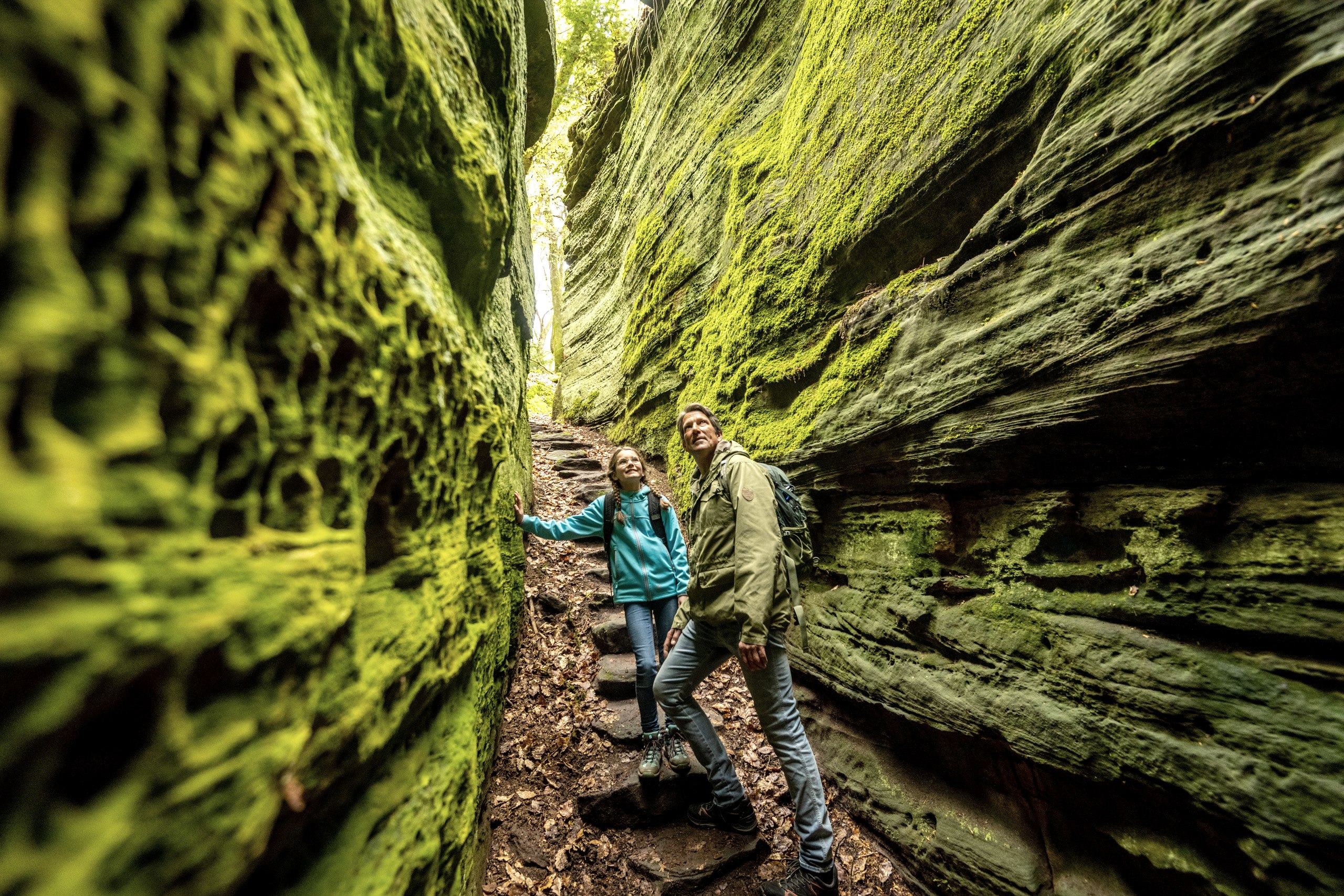 Un sentier forestier mène au cœur d'un monde féerique avec des parois rocheuses érodées par les intempéries, des gorges et des fissures, des blocs de pierre moussus et de hautes tours rocheuses. En fait, il s'agit d'un fond marin vieux d'environ 190 millions d'années, qui a été façonné au fil du temps par les forces de la nature pour former ces rochers. Mais il pourrait aussi avoir été créé par des géants - ou par le diable, plus proche des habitants du sud de l'Eifel, marqués par le catholicisme.