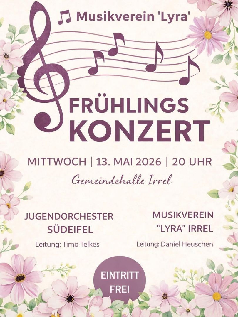 Concert de printemps de l'association MV LYRA IrrelL'entrée est gratuite et le concert aura lieu dans la salle communale "Neue Mitte Irrel". Nous nous réjouissons de votre visite !