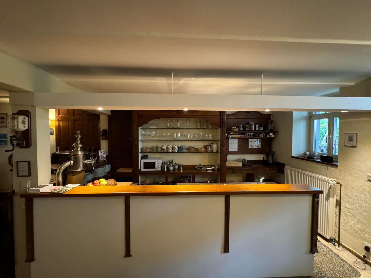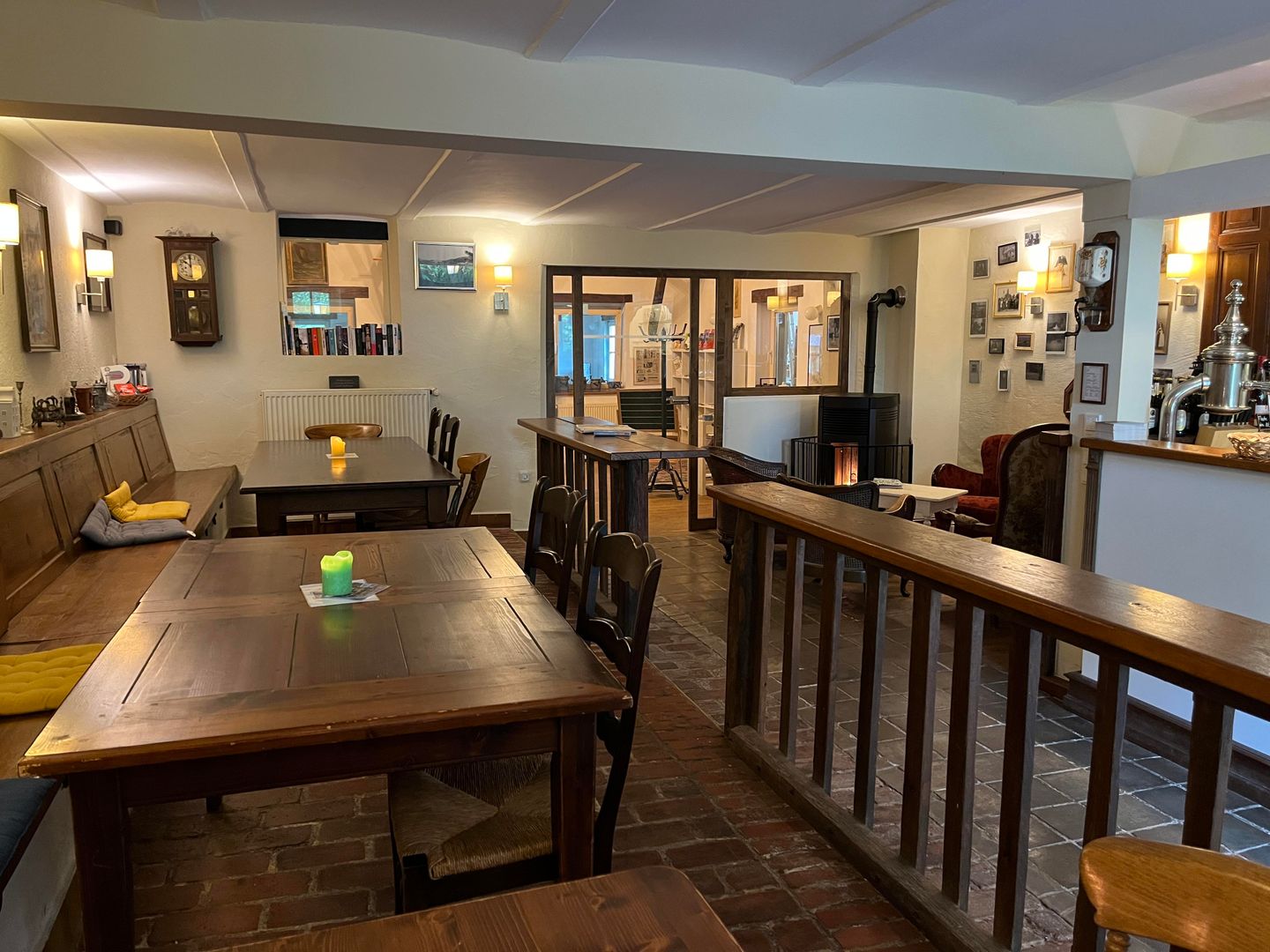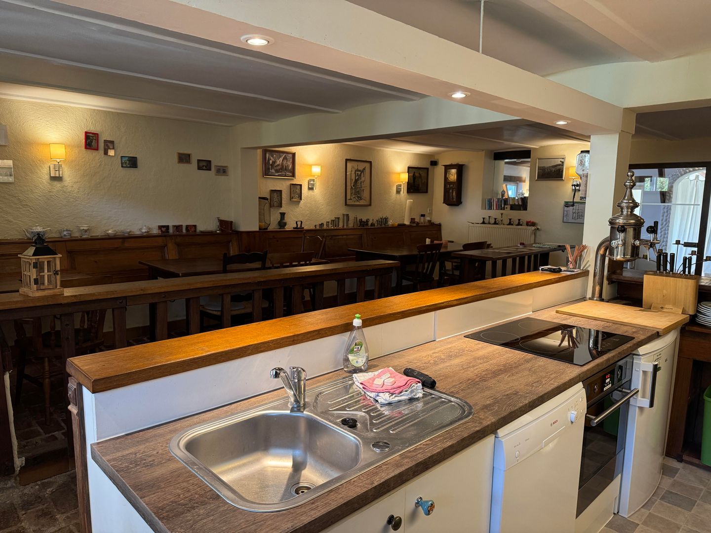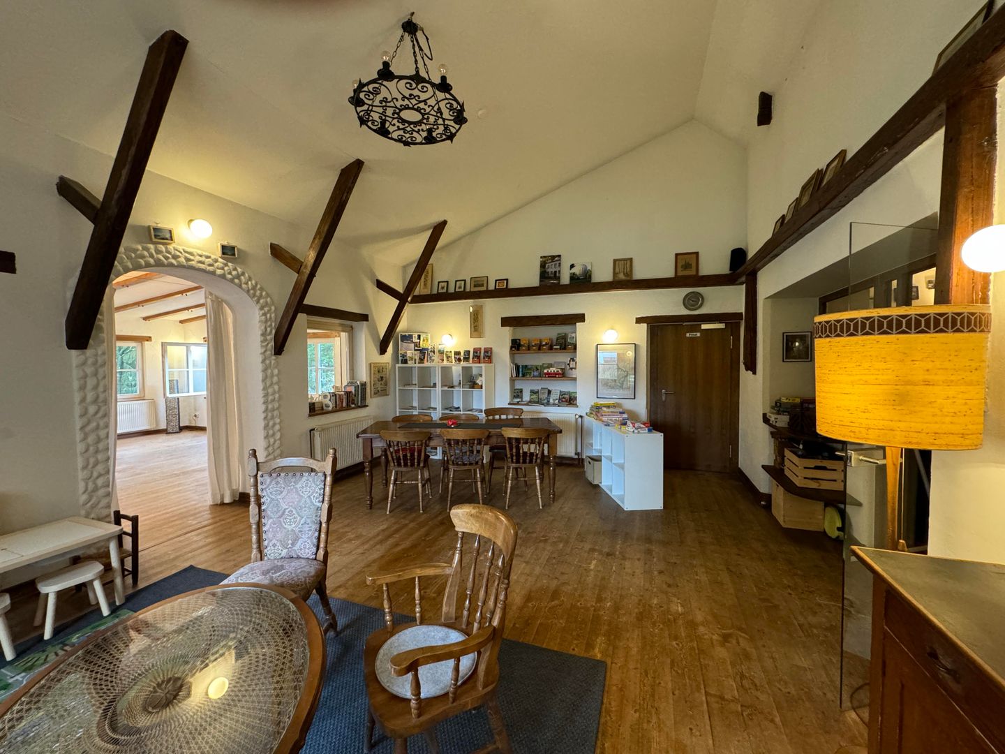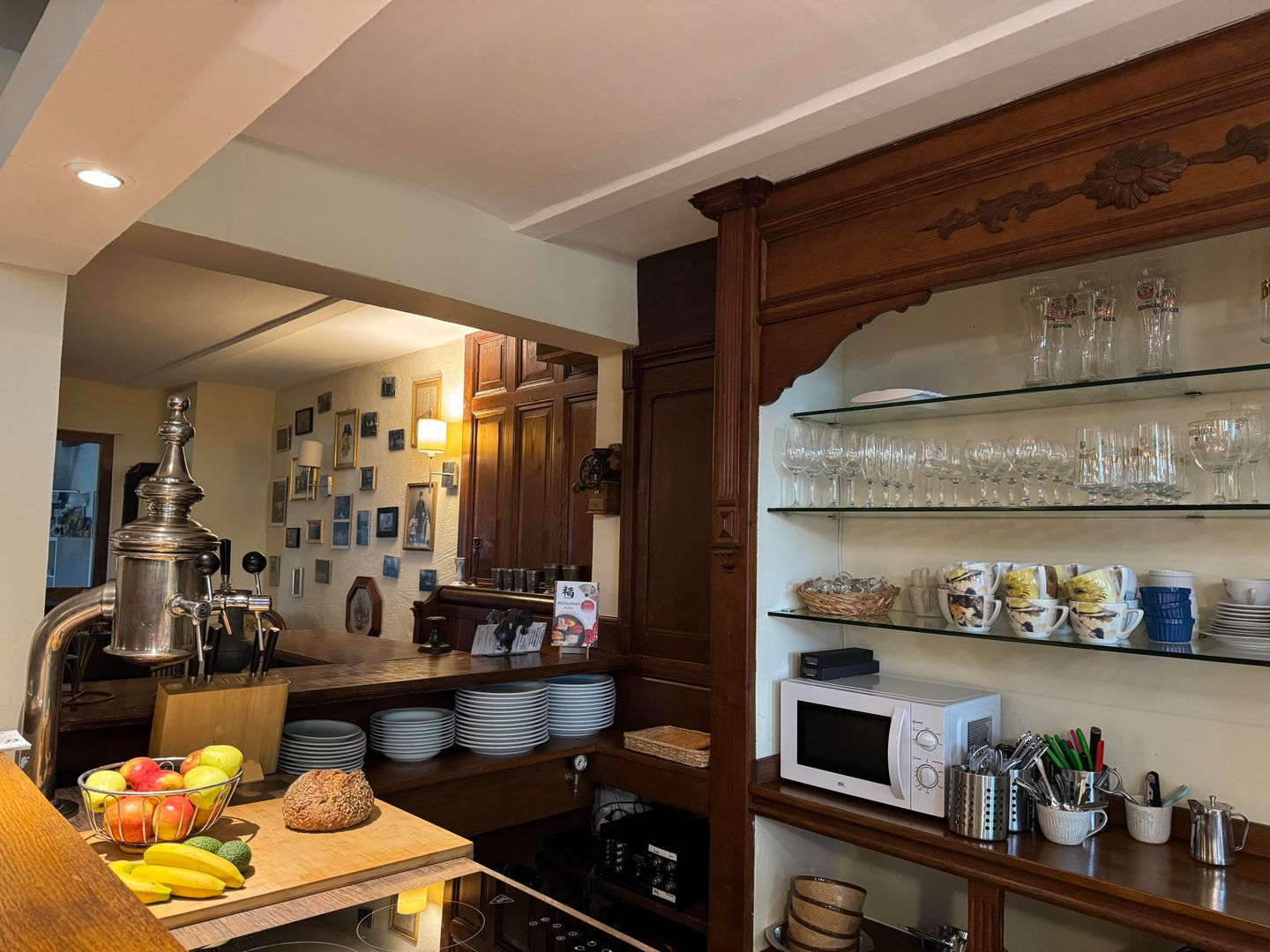 En traversant notre préau, on arrive dans une salle à manger confortable qui dispose d'une cuisine de self-service. La salle à manger servait autrefois d'étable, ce que l'on peut encore voir aux mangeoires transformées en bancs et au sol rustique en pierre. La cuisine indépendante est équipée de tous les ustensiles de cuisine nécessaires, ainsi que d'un équipement de base en thé, café, épices, etc.