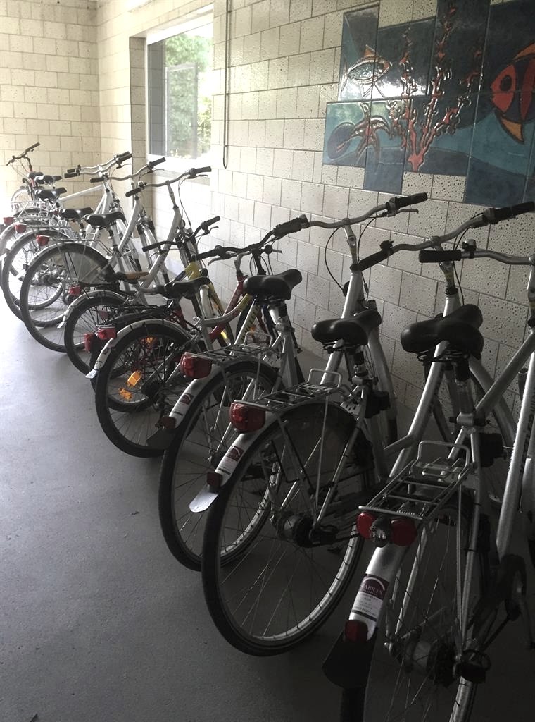 Große Fahrrad- und Motorradhalle zum Unterstellen vorhanden. Fahrradreinigungsstation im Außenbereich.