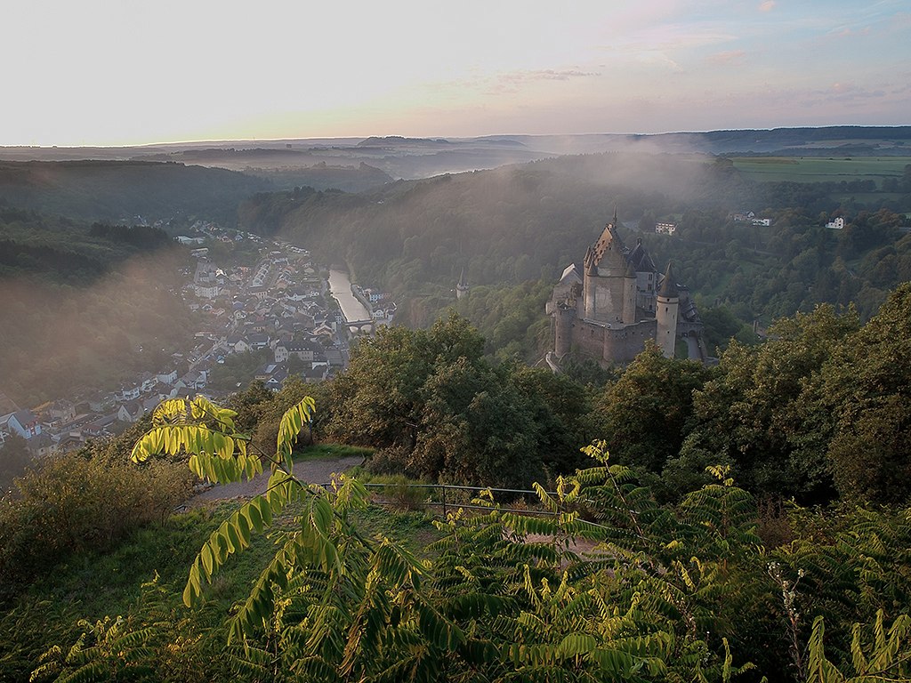 De Nat'Our Route 5 begint in het middeleeuwse stadje Vianden, iets ten zuiden van de bezienswaardige St. Rochuskerk, die duidelijk over het hoofd wordt gezien door de stuwmuur. Je gaat bergopwaarts naar het herbouwde kasteel van Vianden, een van de belangrijkste en machtigste kastelen van Europa. Het kasteel is een bezoek van enkele uren meer dan waard. Laat het nu links liggen, win snel hoogte via serpentines en bereik het bergstation van de Vianden stoeltjeslift. Vanaf hier maak je een rustigere wandeling door dun gemengd bos naar de Bildchenkapel, vanwaar je een prachtig uitzicht hebt over de afgedamde Our en zijn vallei. Bergafwaarts omzeil je turbine 10, die uit de berg oprijst, en bereik je de "Ourdall Promenade", die je volgt tot de blauwe brug achter Bivels. Na de brug ben je nu op Duitse bodem. Een bospad leidt bergopwaarts naar de rotsachtige uitloper waarop de ruïne van Falkenstein troont. Het kasteel kan niet worden betreden, maar een klein paviljoen voor het uitdagende toegangsportaal biedt betoverende Doornroosje-romantiek met uitzicht op het kasteel.