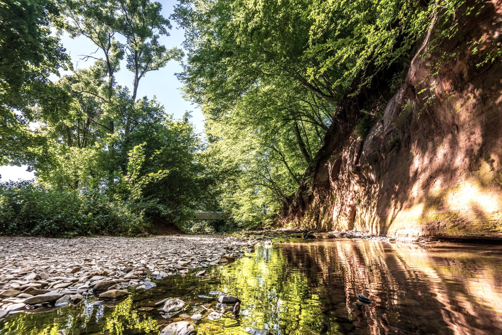 Drie diep ingesneden kloven van rode zandsteen drukken hun stempel op deze wandeltocht in het NaturWanderPark delux.