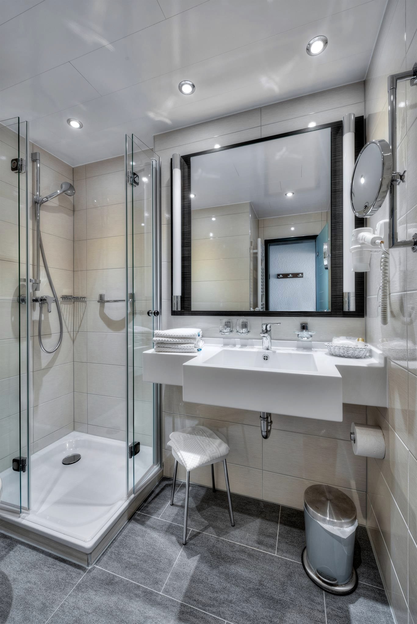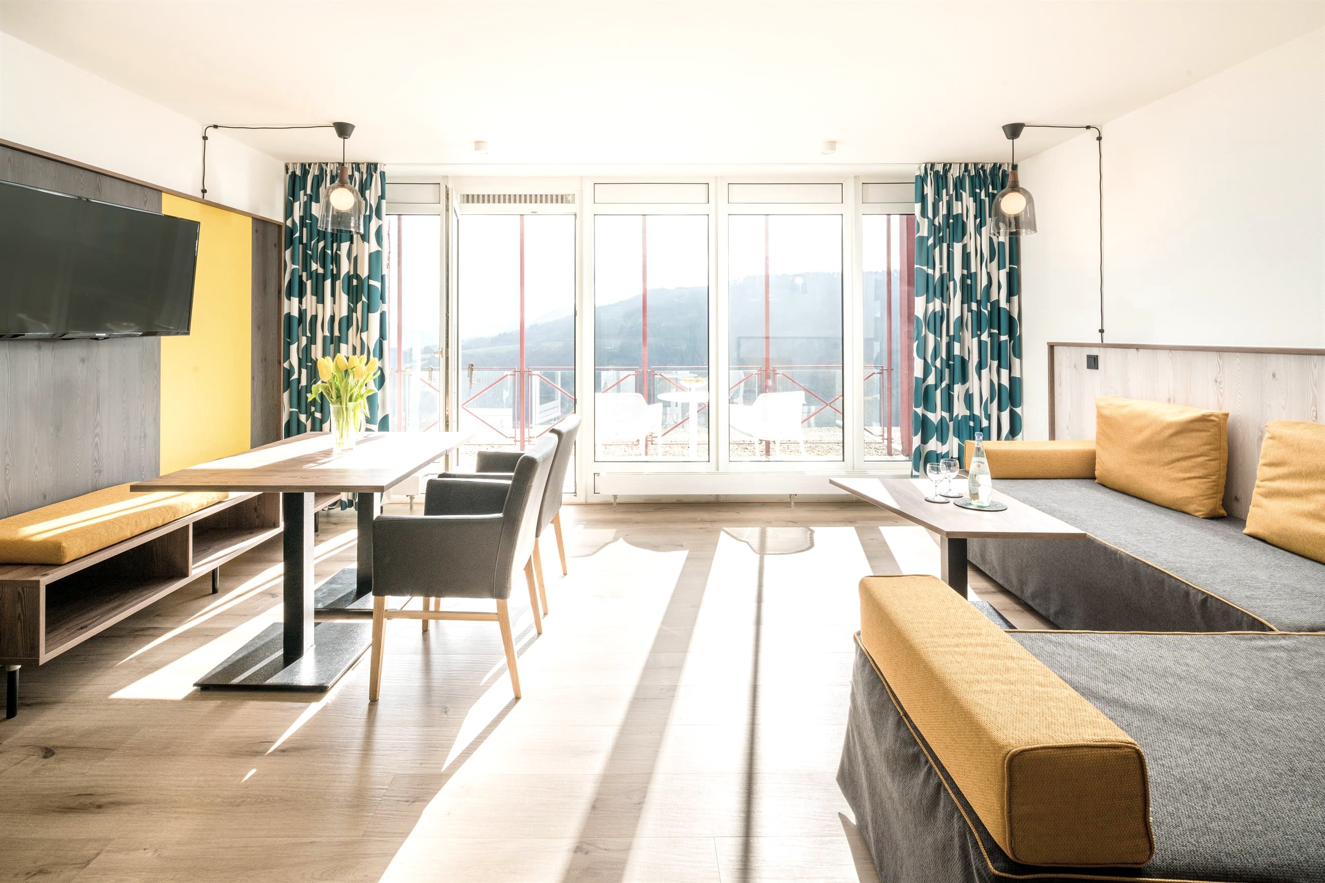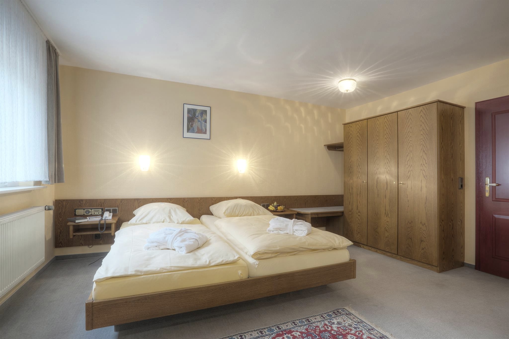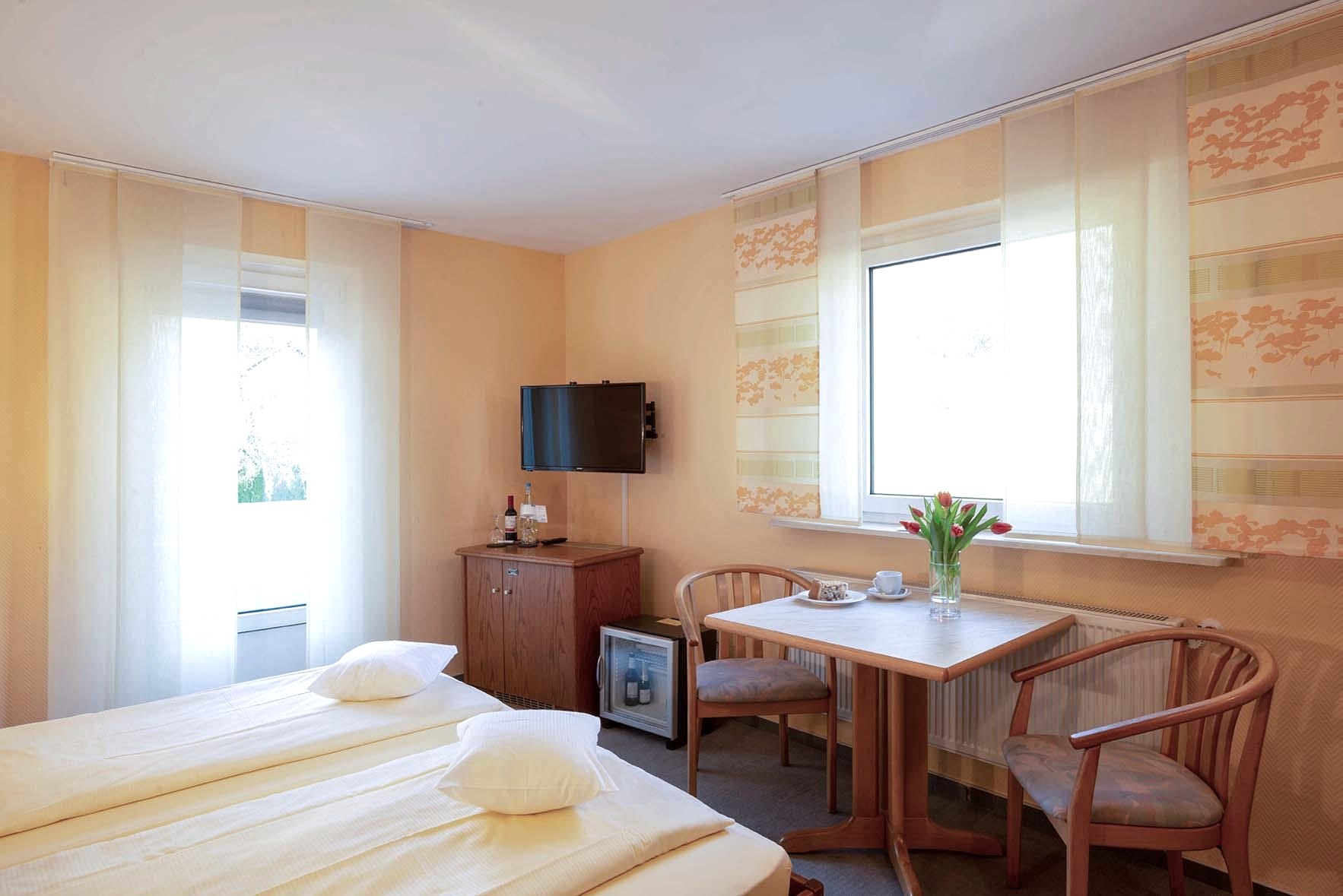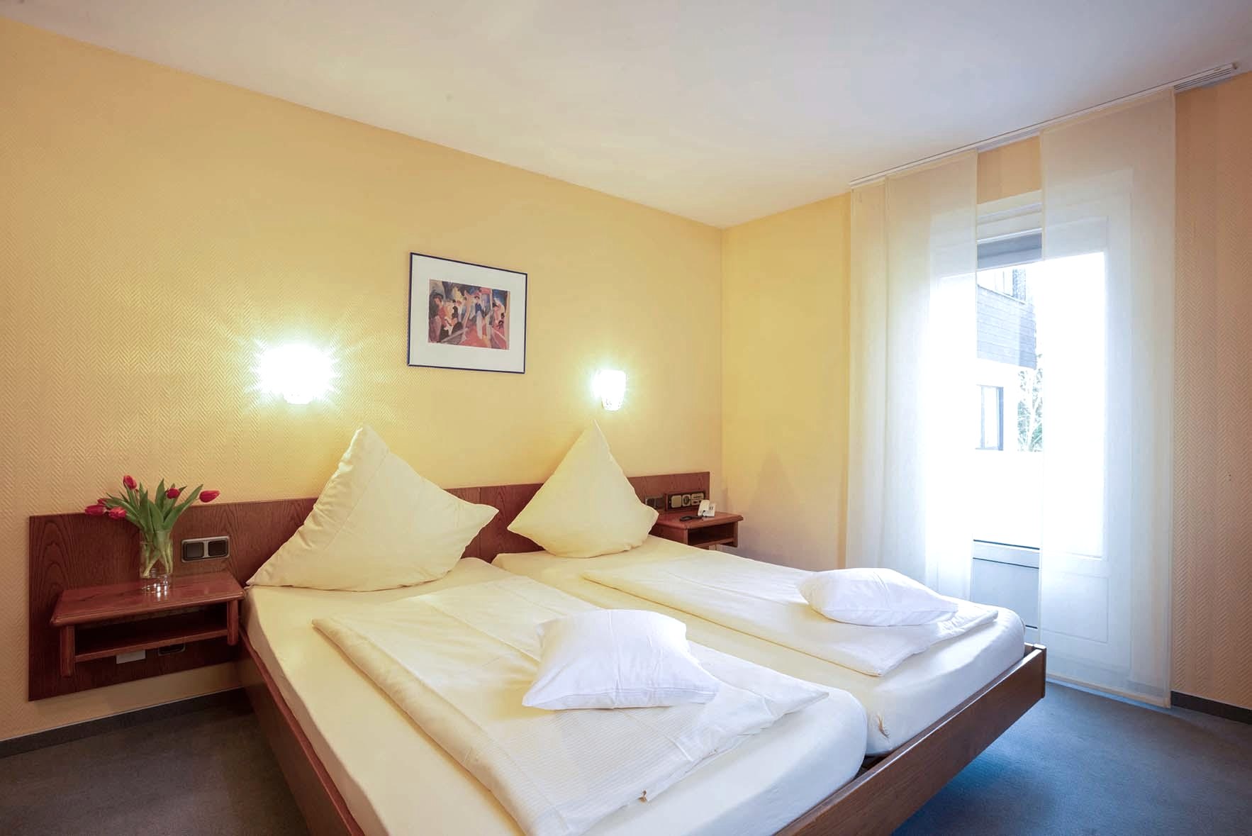 De lift brengt u naar de comfortabele gastenkamers, uitgerust met douche / toilet, balkon, telefoon met directe buitenlijn en tv-aansluiting. Uw dag begint met een uitgebreid "pick-me-up" ontbijtbuffet. Overigens: u mag ook uw hond meenemen!