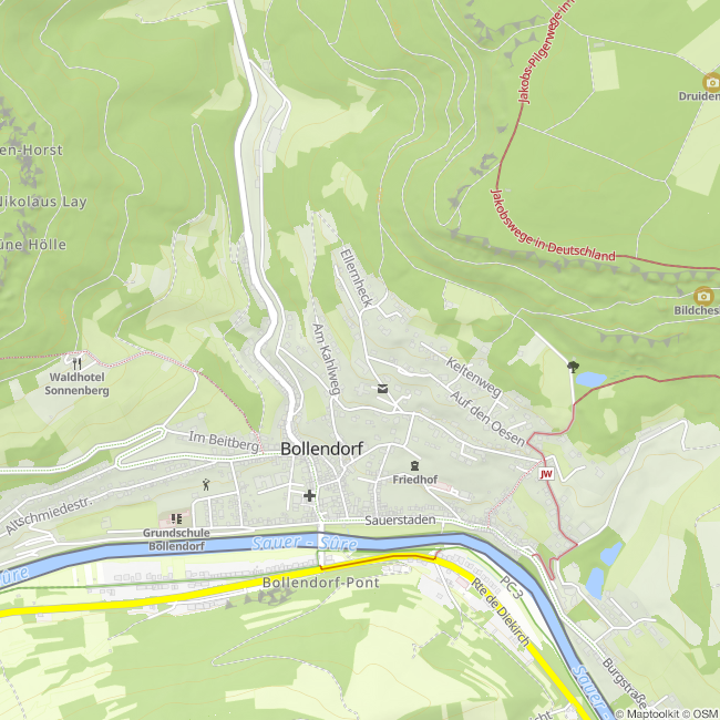 In het wandelgebied Zuid-Eifel ligt Bollendorf midden in het Duits-Luxemburgse natuurpark en Luxemburgs Klein Zwitserland. (Müllerthal)