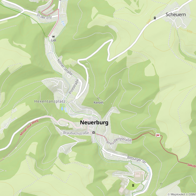 Vom Marktplatz Neuerburg gelangt man über den Aufstieg zum Beilsturm auch zu den Aussichtpunkten „Kleine und Große Kanzel“ oberhalb der Altstadt. Von hier aus bietet sich ein malerischer Blick über die Dächer der Stadt Neuerburg, die Burganlage und die Landschaft des romantischen Enztals.