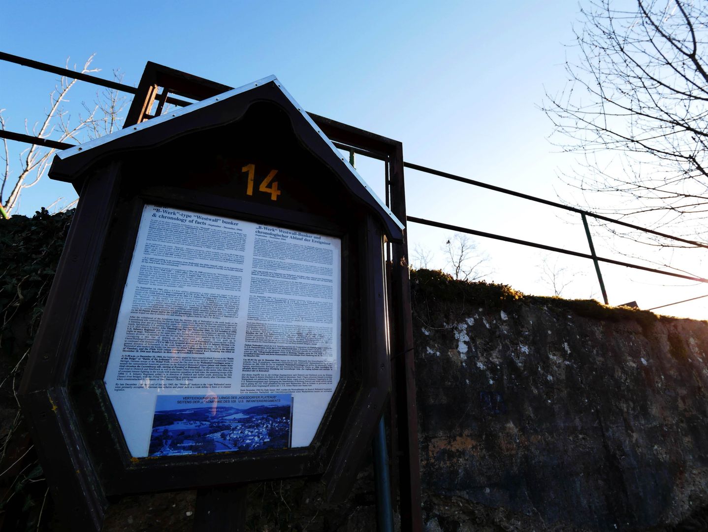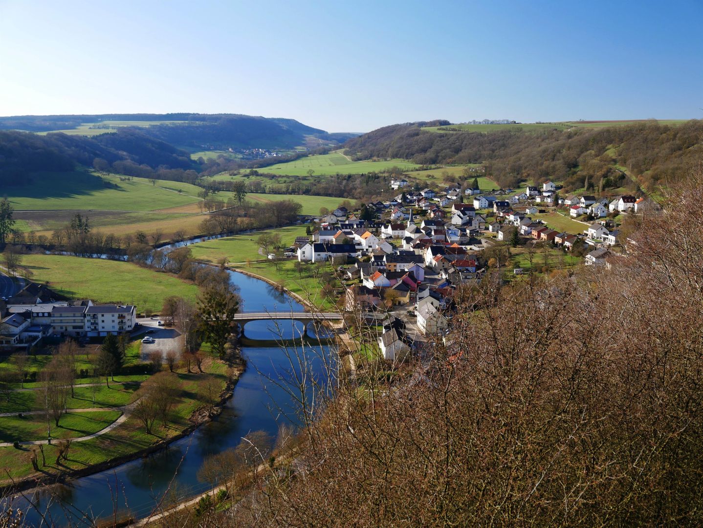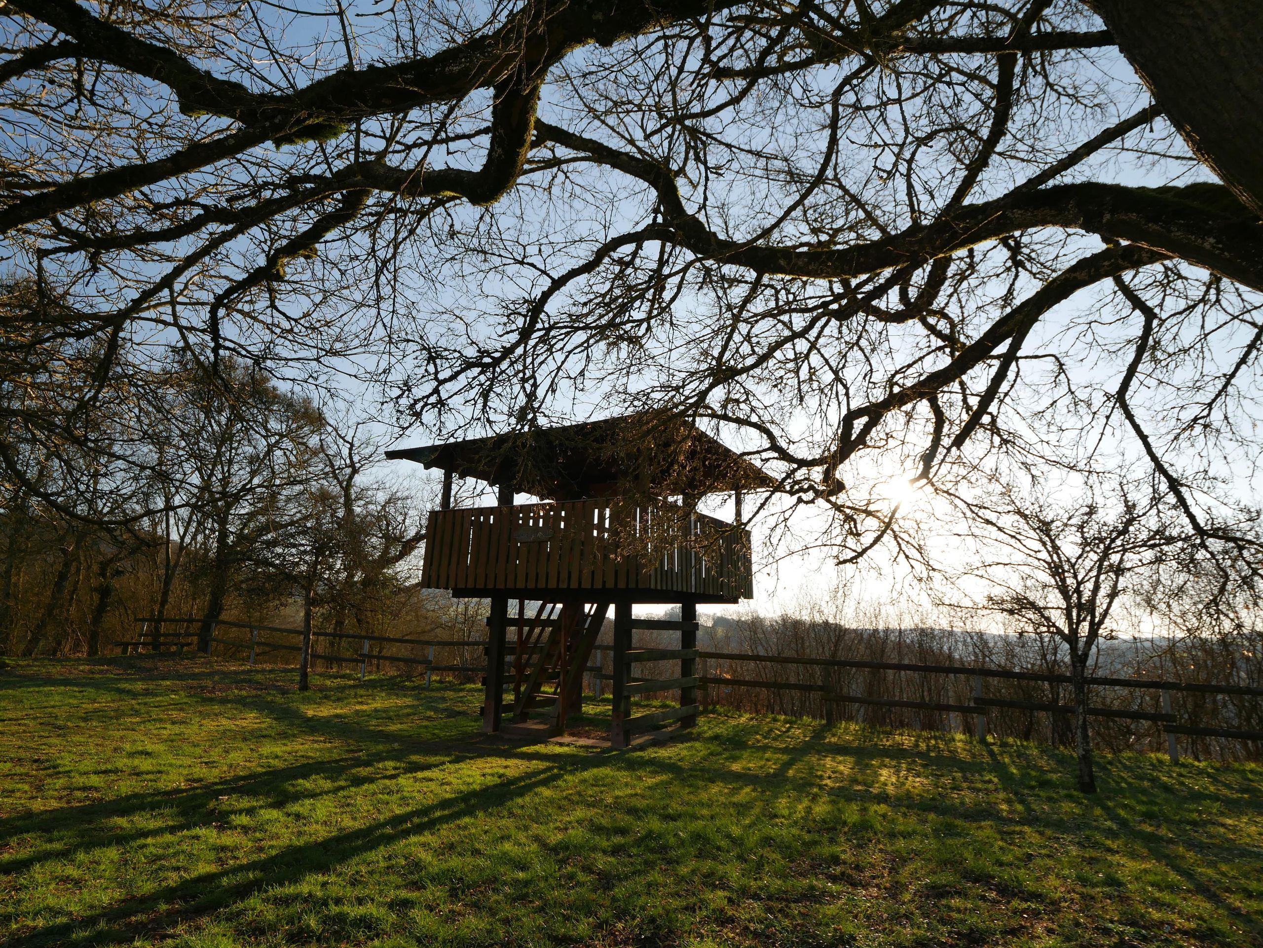 Vom sogenannten "Römerturm", einem hölzernen Aussichtsturm am Rand des Plateaus, hat man einen weiten Blick über die Täler der Sauer und der Our und ins benachbarte Luxemburg.