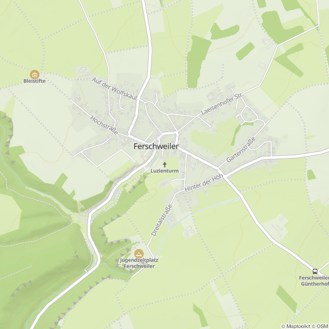 Bis 1876 stand auf der kleinen Anhöhe am Ostrand von Ferschweiler die kleine spätgotische Kirche St. Luzia mit dem charakteristischen Turm. Fast 50 Jahre zuvor hatte das Dorf eine neue, größere Kirche erhalten, nicht weit entfernt, die noch heute die Pfarrkirche ist. Vom alten Kirchenschiff sind heute nur noch Mauerreste erhalten, der Turm mit dem charakteristischen Treppengiebel aber blieb bestehen und ist ein sehenswertes Denkmal. Die kleine Dorfkirche war kunstvoll im spätgotischen Stil erbaut, mit Gewölbe und Fenstern mit schönem Maßwerk. Ihr Grundriss ist gut erkennbar, einzelne Elemente der Architektur und der Ausstattung sind noch zu sehen. Ein Fenstersturz trägt das Datum 1534; der Treppengiebel des Turms ist aber erst im 18. Jahrhundert entstanden.
