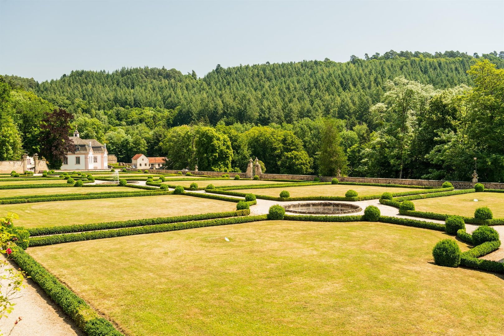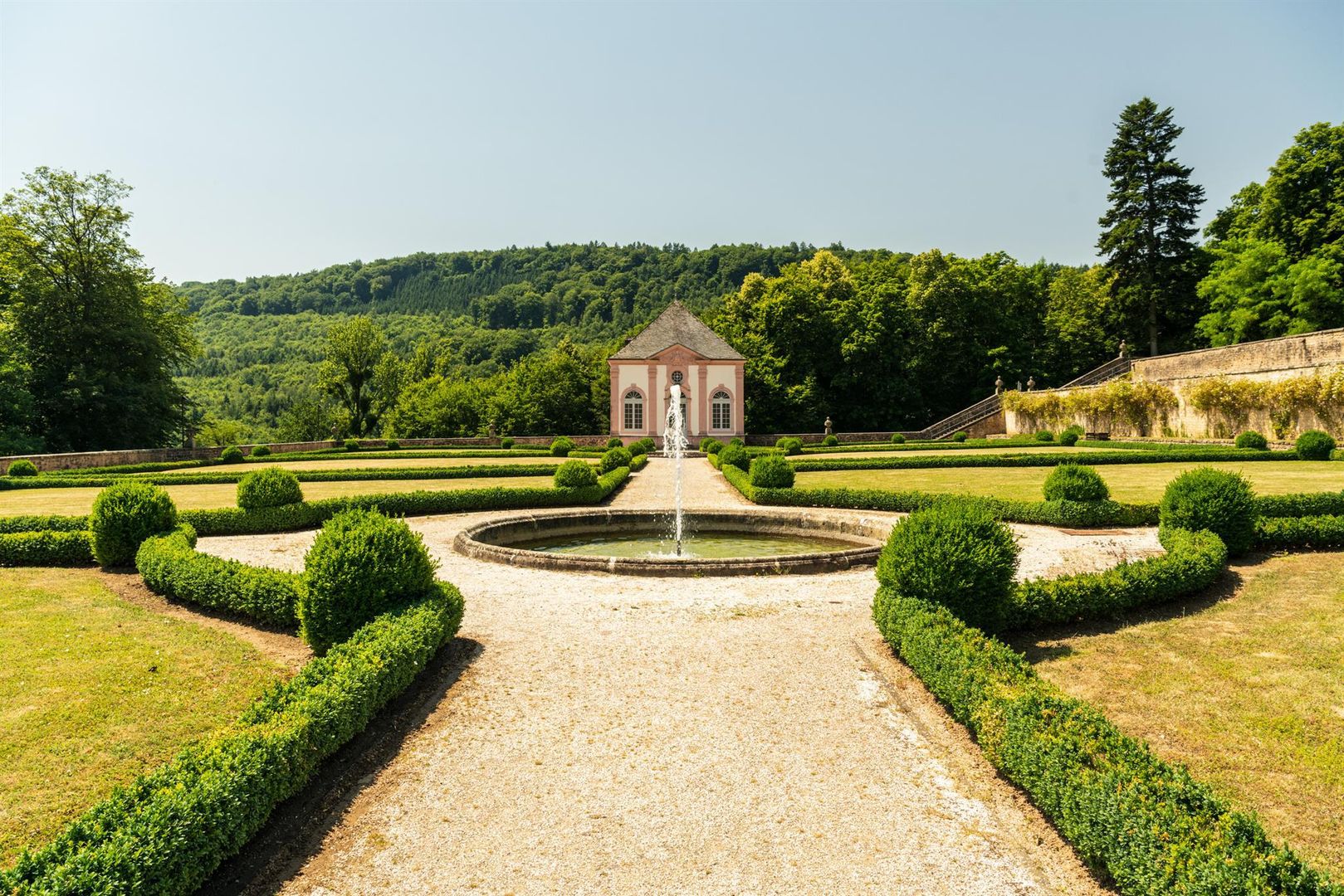 Ein Weg führt zur erhöht gelegenen Gartenanlage mit Pavillon, Terrassen und einem Brunnenhaus. Doch sind noch zahlreiche weitere Gebäude in der Umgebung des Schlosses zu sehen, die meisten davon heute Ruinen. Sie bezeugen, dass Abt Limpach nicht nur lebensfroh, sondern vor allem ein Geschäftsmann war: Sein Schloss diente zugleich als Verwaltungssitz der zuvor neu errichteten, großen Eisenhütte am Weilerbach. Wie kam es dazu?