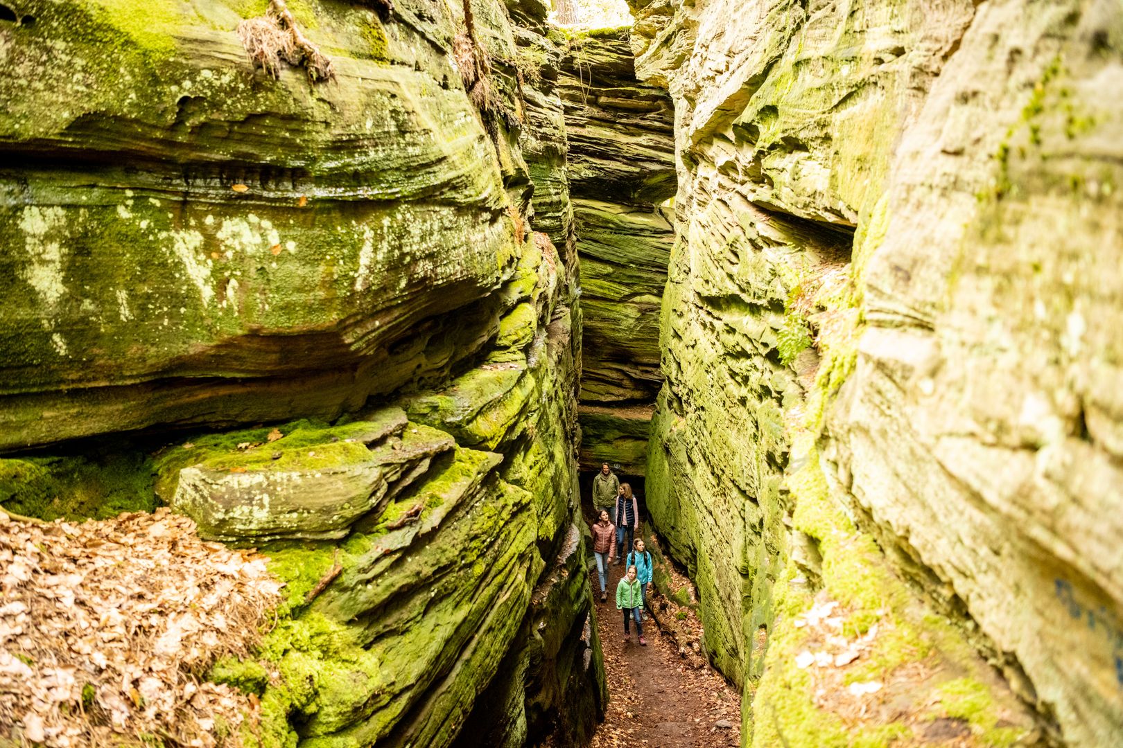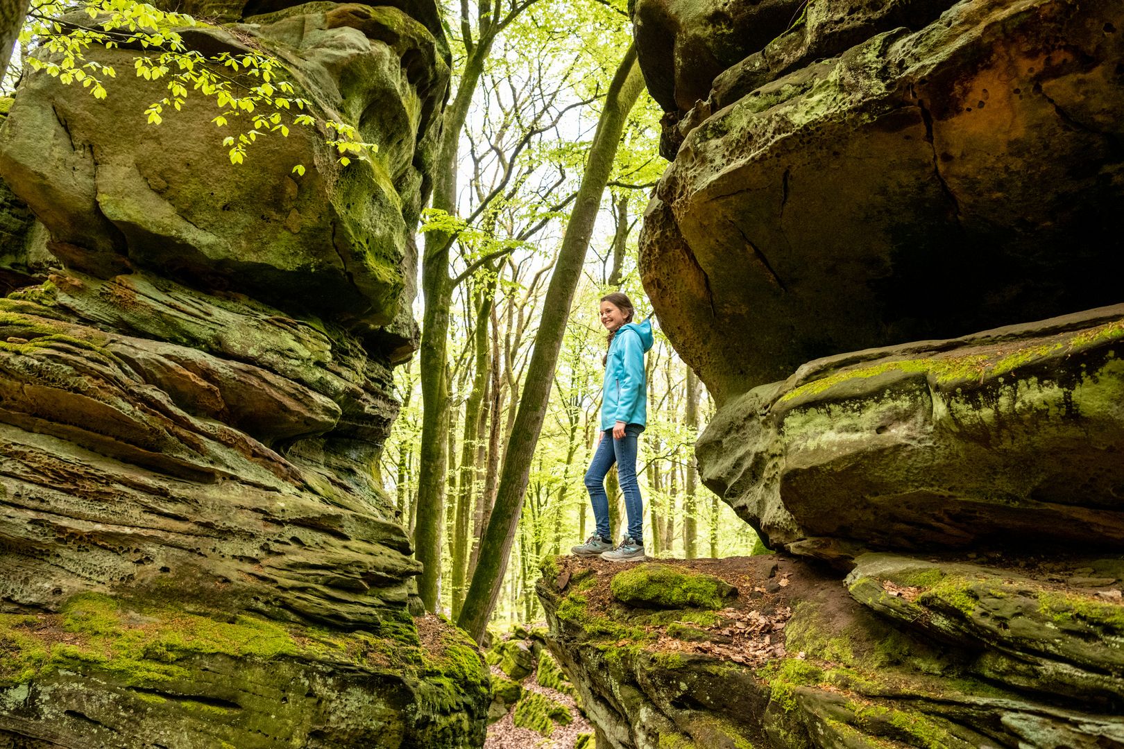 Namensgeber der Tour ist die "Grüne Hölle" eine der beeindruckenden Felsformationen der Südeifel. Zum Ende der letzten Eiszeit sind viele große und kleine Klüfte entstanden. Kaum ein Sonnenstrahl erhellt die Grüne Hölle. Sie ist so grün, weil der Sandstein Wasser aufsaugt wie ein Schwamm - beste Voraussetzungen für Moos, Algen und Flechten.