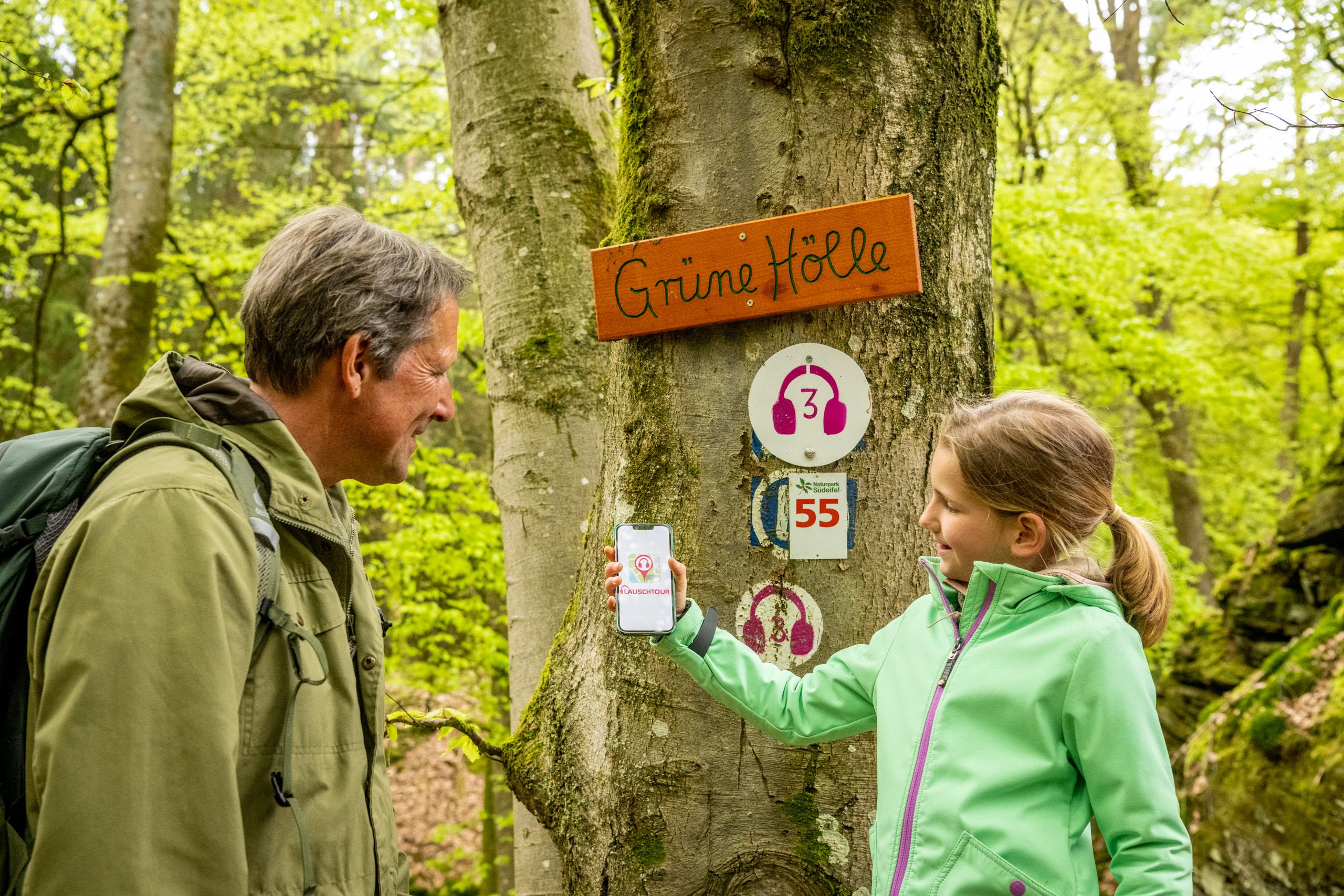 Marco Neises, gebürtiger Bollendorfer und Schöpfer genialer Lauschtouren, ist mit Menschen aus dem Dorf unterwegs. An 10 Hörstationen im Bollendorfer Wald erzählen sie ihre Geschichten über die Felsen, Tiere, Geschichte und Aussichtspunkte. So packt Paul Colljung Schmugglergeschichten aus, der Hausarzt gibt Tipps und Wanderführer Manfred Schmidt warnt vor einer 300 Jahre alten Kräuterhexe...Die Audiotour "Grüne Hölle Bollendorf" können Sie kostenlos per App auf Ihr Smartphone herunterladen.