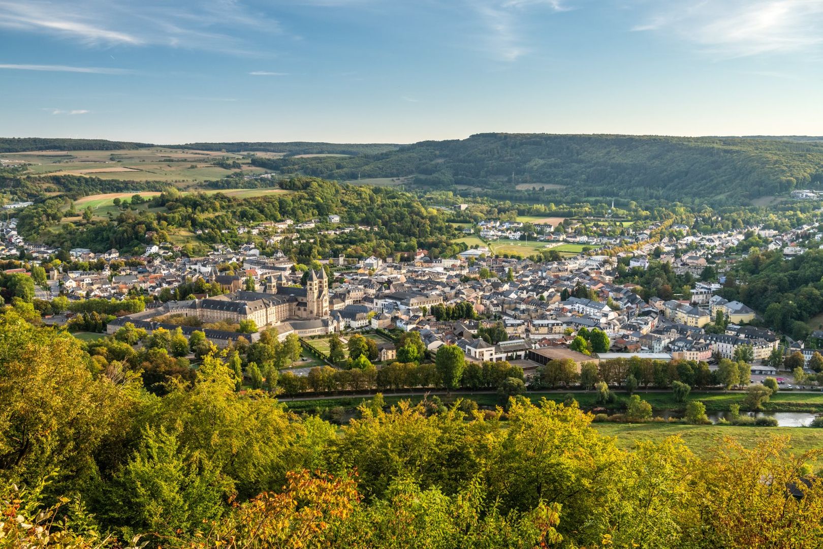 Das Glockengeläut der im Tal liegenden Echternacher Basilika hallt empor. Am nächsten Aussichtspunkt steht die Liboriuskapelle nahe einer Felsenklause mit einem sensationellen Blick auf Echternach mit der imposanten Reichsabtei, die auf das 7. Jahrhundert zurückgeht.