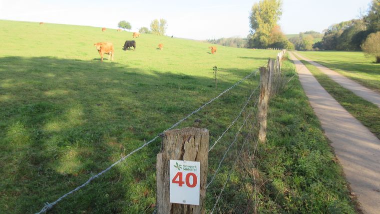 Von hier geht es an einer kleinen Baumallee entlang ins Tal hinab. Idylle pur erwartet Sie hier: erst ein kleines Wäldchen, dann hört man den Bach und die zwitschernden Vögel, kurz darauf begrüßen Sie die Rinder auf den weiten Wiesen.