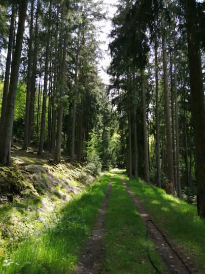 Ein kleiner Bachlauf führt entlang des Weges. Nicht selten trifft man hier tatsächlich ein Rudel Rotwild an.