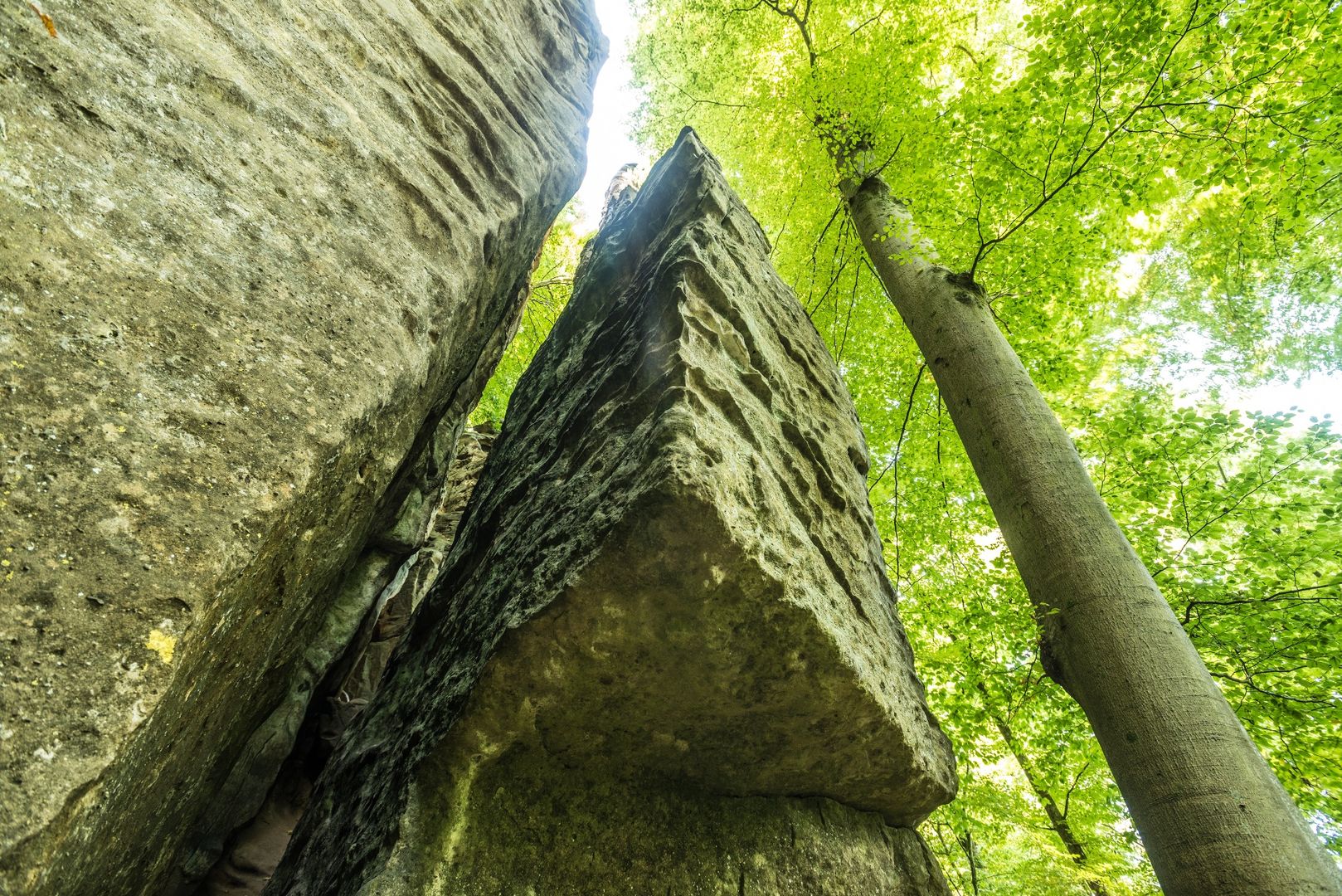 Schiefe und krumme Stufen führen hinab in die kühle, feuchte Schlucht. Vorsicht, kurz den Kopf einziehen und durch die enge Stelle quetschen! Kaum zu glauben, dass dieser Sandstein einst ein Meeresboden war... Weiter geht's auf einem Steg und dann wieder viele Stufen hinab, bis sich der Blick ins bewaldete Tal öffnet.