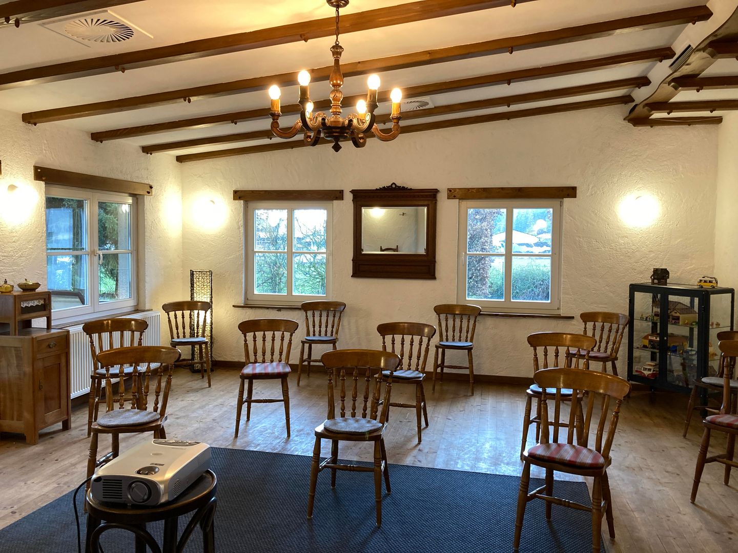 Unser Seminarraum kann für Kurse, Workshops und Veranstaltungen gemietet werden. Der lichtdurchflutete Raum hat einen Ausgang auf die Veranda in unserem hinteren Garten. Man blickt auf unseren alten Walnussbaum, unser Schwein Jacky und die Hühner, mehr Ablenkung gibt es hier nicht.