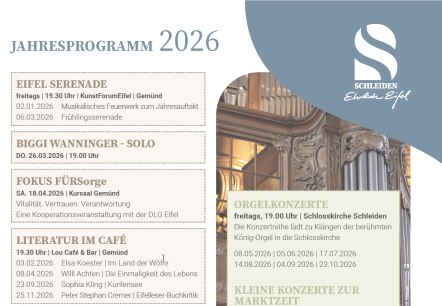 Ob in unserer Stadt, Region oder individuelle für Sie. Vielfältig sind die Angebote von Orgelkonzerten auf der berühmten König-Orgel in der Schlosskirche Schleiden, Mundart-Wanderungen und Stadtführungen, Familienprogrammen und Vernissagen im Kunstforum Eifel in Gemünd oder der Galerie Eifel Kunst in Schleiden, von Kurkonzerten bis zum Reggae-Abend: in der Stadt Schleiden finden sich stets Anlässe für das gesellige Zusammensein oder den Kunstgenuss…