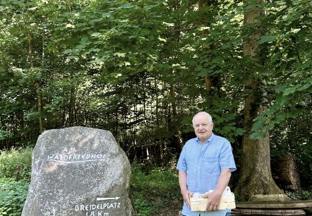Anwohner Gerd Kauth renoviert die Markierungen auf dem Höhenrundweg Maria Laach.