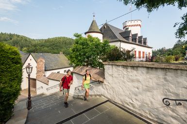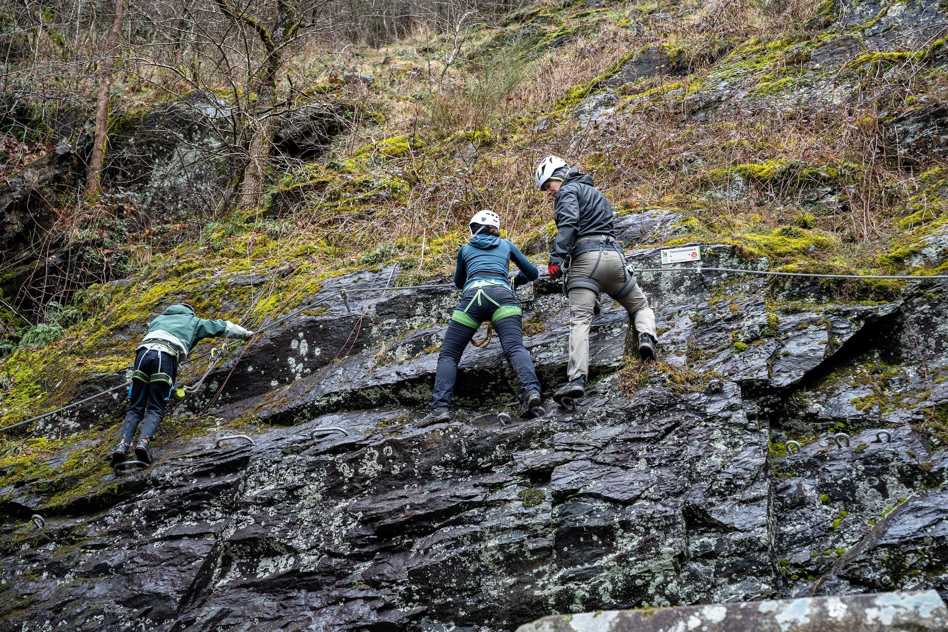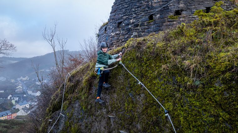 Neuerburg im schmalen Tal der Enz, umgeben von Schieferfelsen, ist prädestiniert für ein Klettererlebnis. Dabei verfolgt der Neuerburger Klettersteig einen ganz eigenen Ansatz: Die ca. 4,5 km lange Rundroute nutzt die bestehende Wanderwegeinfrastruktur und verknüpft Teilstrecken des Premium-Wegs „Neuer-Burg-Weg“ und eines lokalen Wanderwegs mit Kletterpassagen an sechs ausgewählten Felspartien, die spektakuläre Blicke auf die Stadt bieten. Das Besondere: Diese Passagen können auch umwandert werden, so dass das Konzept sowohl klassische Wanderer als auch Kletterbegeisterte anspricht, die gemeinsam auf der Route unterwegs sein können. Es eignet sich damit auch für Familien mit Kindern.